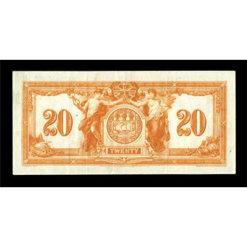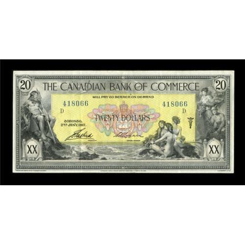 <B>Toronto, ON- The Canadian Bank of Commerce</B></I> $20 Jan. 2, 1917 Ch. # 75-16-04-20a<BR> A strikingly attractive example with a bright yellow background tint combined with a blue, green, lilac and rose colored central vignette. The reverse is a blazingly vivid orange. Fold counters will label this lovely specimen as Very Fine+. To this cataloguer, the note's incredible originality and spectacular eye appeal easily catapults this into the <B>Extremely Fine</B></I> ranks. <BR><I>From The Thomas M. Flynn Collection</B></I><BR><BR><b>Shipping:</b> Coins & Currency (<a target="_blank" href="http://www.heritageauctions.com/common/shipping.php">view shipping information</a>)