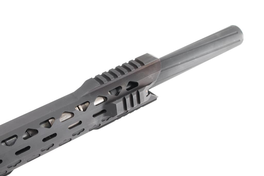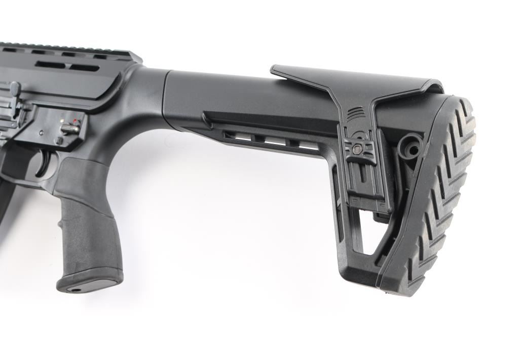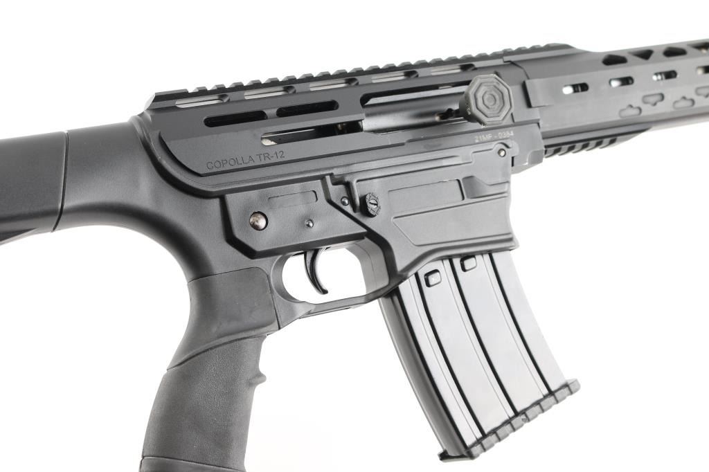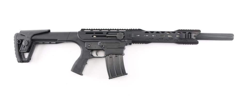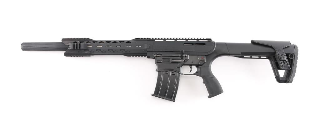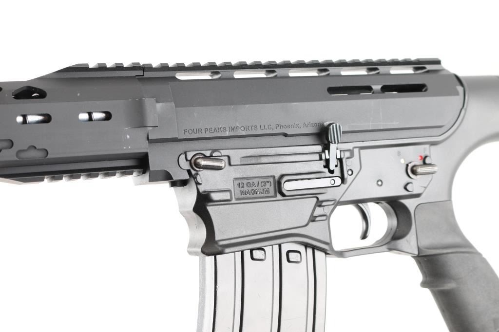 S/N: 21MF-0384. Made in Turkey for Four Peaks Phoenix, AZ. This gas operated, magazine fed, semi-automatic 12 Gauge shotgun is chambered for 3" shells. Features an 18.5" barrel, matte black finish on forearm, upper receiver & barrel shroud. Black polymer lower receiver, shoulder stock and adjustable cheek riser, rubber textured pistol grip & buttpad. Full Picatinny rail on top receiver, 4" Pic rails on front, top & bottom and 1.5" Pic rail on back top of forearm. No sights, oversized metal charging handle w/octagonal rubber over-sized grip, push button magazine release and smooth curved trigger. LOP is 14". Retains approximately 95% finish with little edge wear. Bore is shiny with a little dirt in barrel. Comes with one metal 5 rd magazine and FULL choke tube installed.
