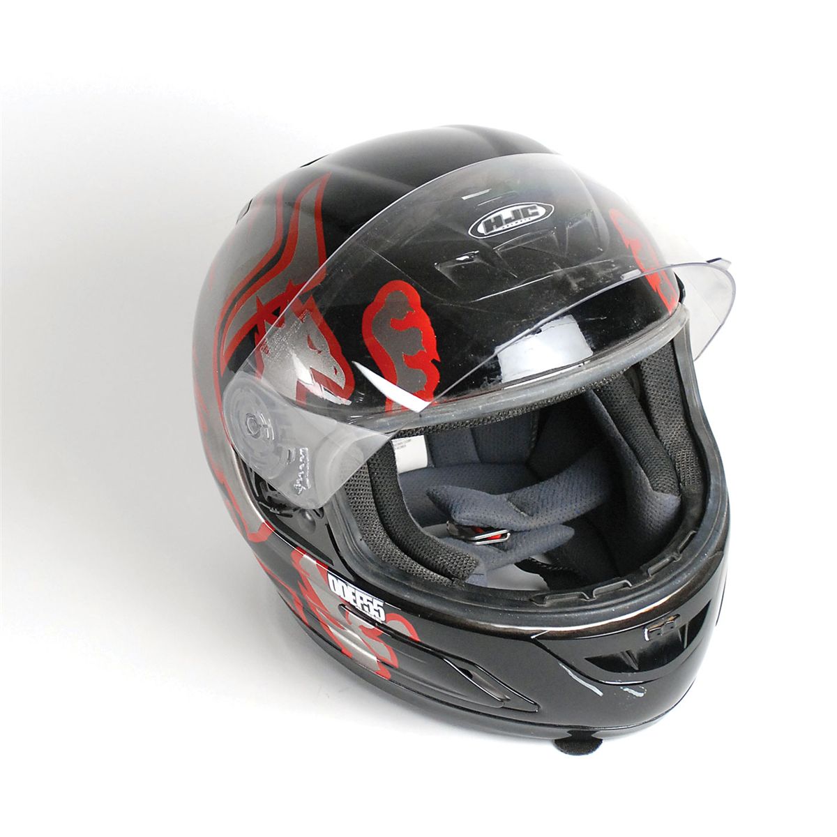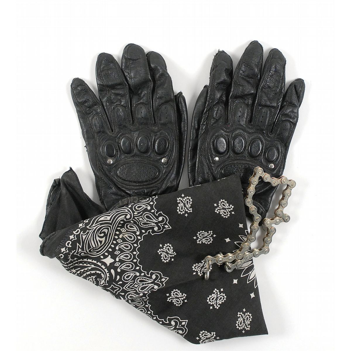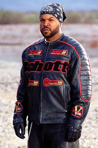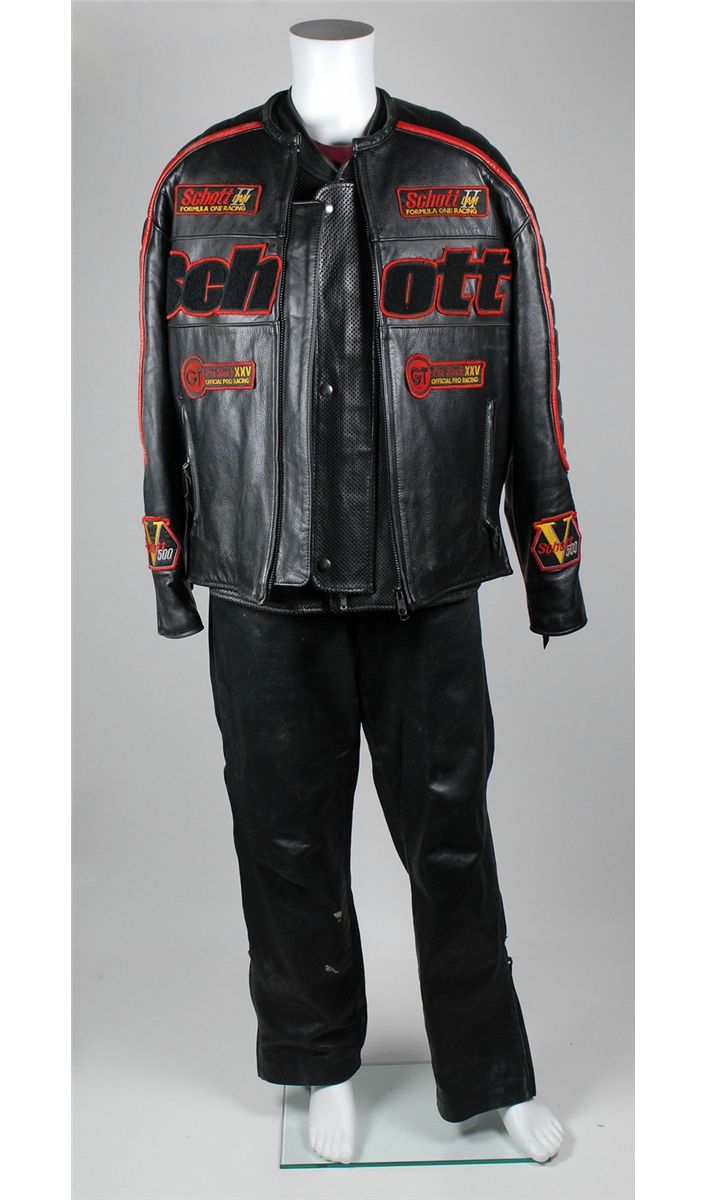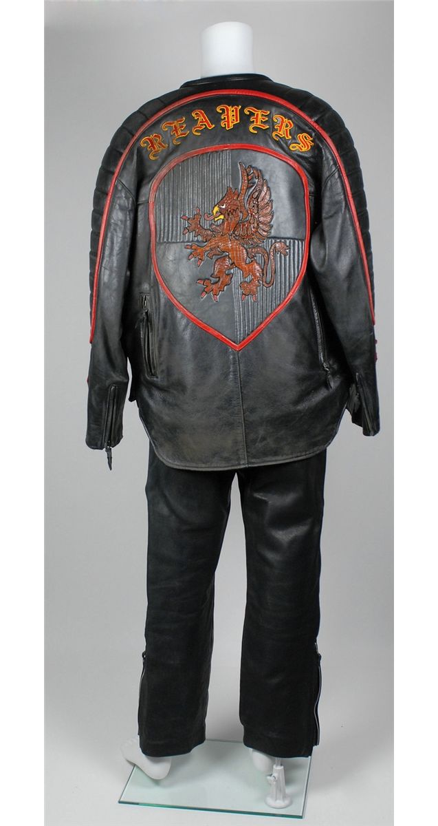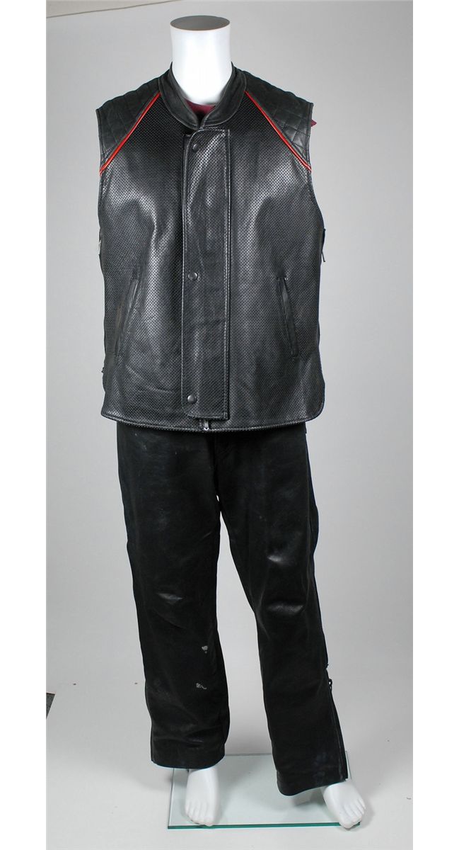 Screen-worn costume worn by Ice Cube in the 2004 film Torque. Costume consists of a heavy black leather motorcycle jacket, made by Tony Nowak, with multiple Schott II Formula One patches sewn onto the front and shoulders with “Trey” written on the maker’s label. Back of the jacket bears a large leather griffin in the center and “Reapers” across the top; a matching pair of ‘aged’ black leather pants; maroon t-shirt; black leather motorcycle vest, with a leather griffin on the back; small motorcycle-chain necklace; a black weighted bandana; leather gloves; and a black HJC motorcycle helmet, highlighted by silver and red griffins on each side. In fine condition, with expected light wear. Accompanied by a certificate of authenticity from Warner Bros. Entertainment Inc.