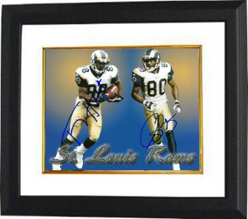 Isaac Bruce was drafted by the Los Angeles Rams in the second round of the 1994 NFL Draft. An All-Pro and four-time Pro Bowl selection, Bruce has amassed 15,208 receiving yards in his career (third all-time). He played the first 14 years with the Rams and won a Super Bowl ring with the team in Super Bowl XXXIV. Torry Holt was named to the Pro Bowl seven times and retired with the 10th most receiving yards in NFL history, including a record six consecutive seasons with 1,300 yards. He was drafted by the St. Louis Rams in the first round of the 1999 NFL Draft, and spent the next ten years with the Rams and is remembered as one of the members of the "Greatest Show on Turf."Isaac Bruce and Torry Holt have both hand signed this St. Louis Rams 8x10 Photo. Certificate of Authenticity from Athlon Sports. Custom White Mat and Black Framed as shown.