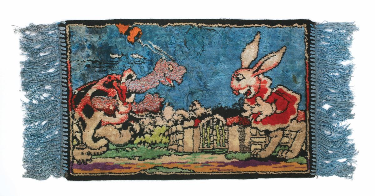 (Alexander Smith and Son, 1935) Beautiful small rug featuring a scene from Disney's "The Tortoise and the Hare". Measures 11.5"x18.5" not including the fringe. Rug is in very good condition overall with some spots of discoloration and wear.