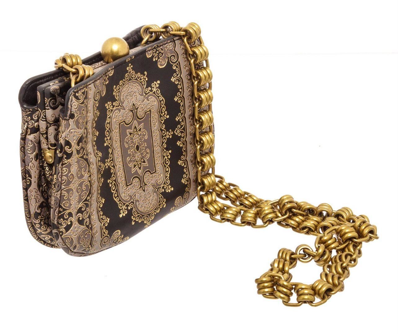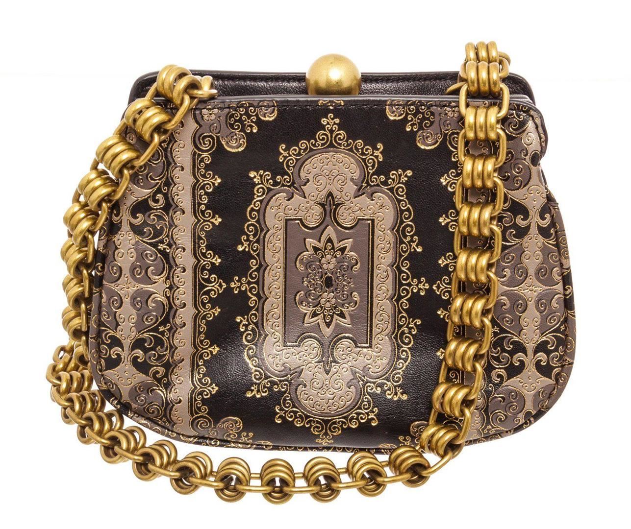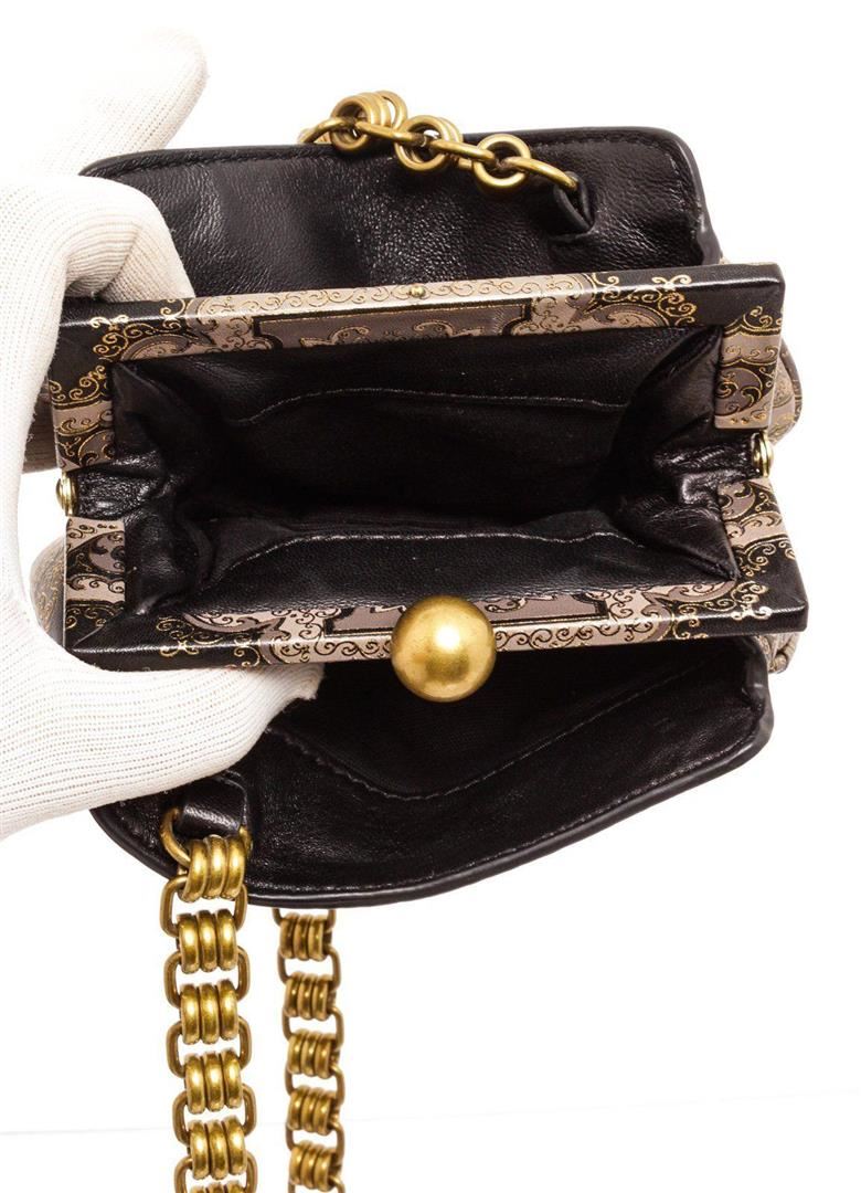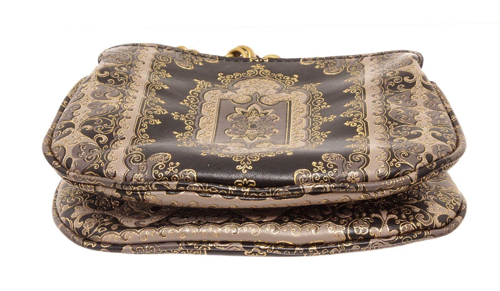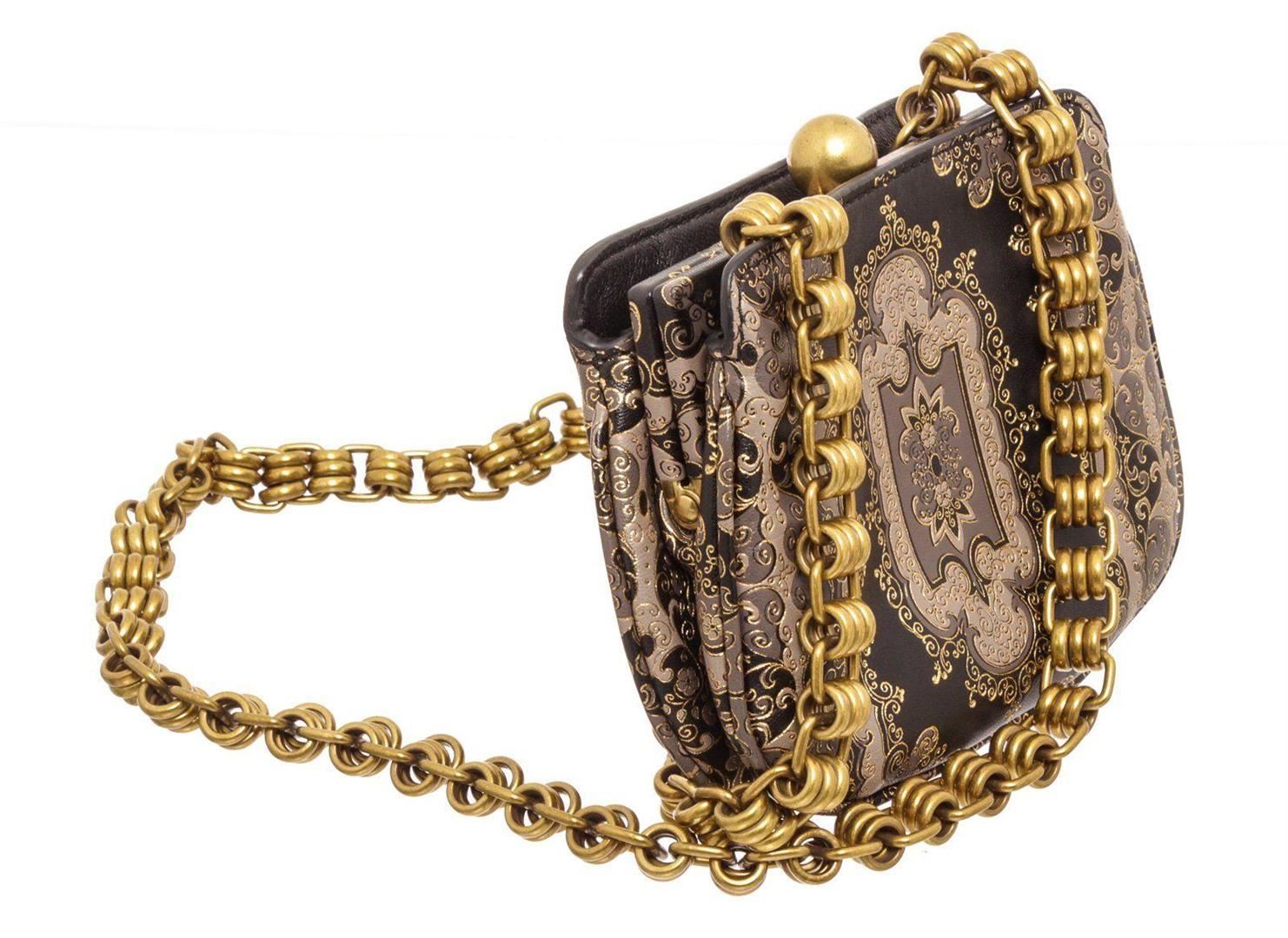 Tory Burch Black Leather Gold Gilded Pattern Small Shoulder Bag with gold-tone hardware, Crafted out of black leather, gold gilded intricate pattern throughout, and chain-link shoulder strap. Inner black fabric lining and French purse closure. Measurements: Length: 6.5 in / 17 cm Width: 1 in / 3 cm 5 in / 13 cm Condition: Pre-Owned Good overall, please see photographs for detail.