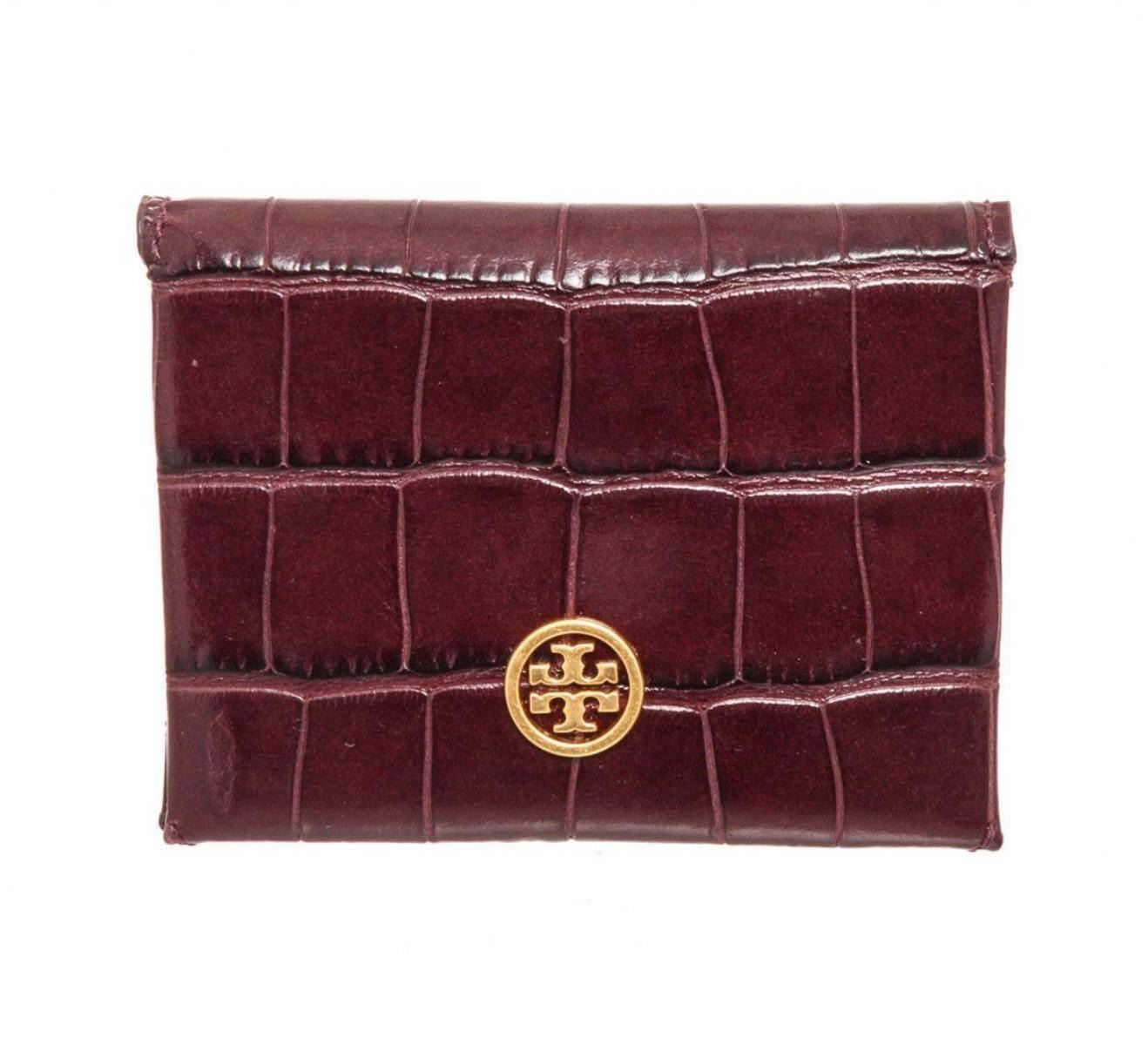 Tory Burch Brown Embossed Parker Foldable Wallet. Tory Burch Brown Embossed Parker Foldable Wallet with gold-tone hardware, interior card holder pockets, and snap closure.
