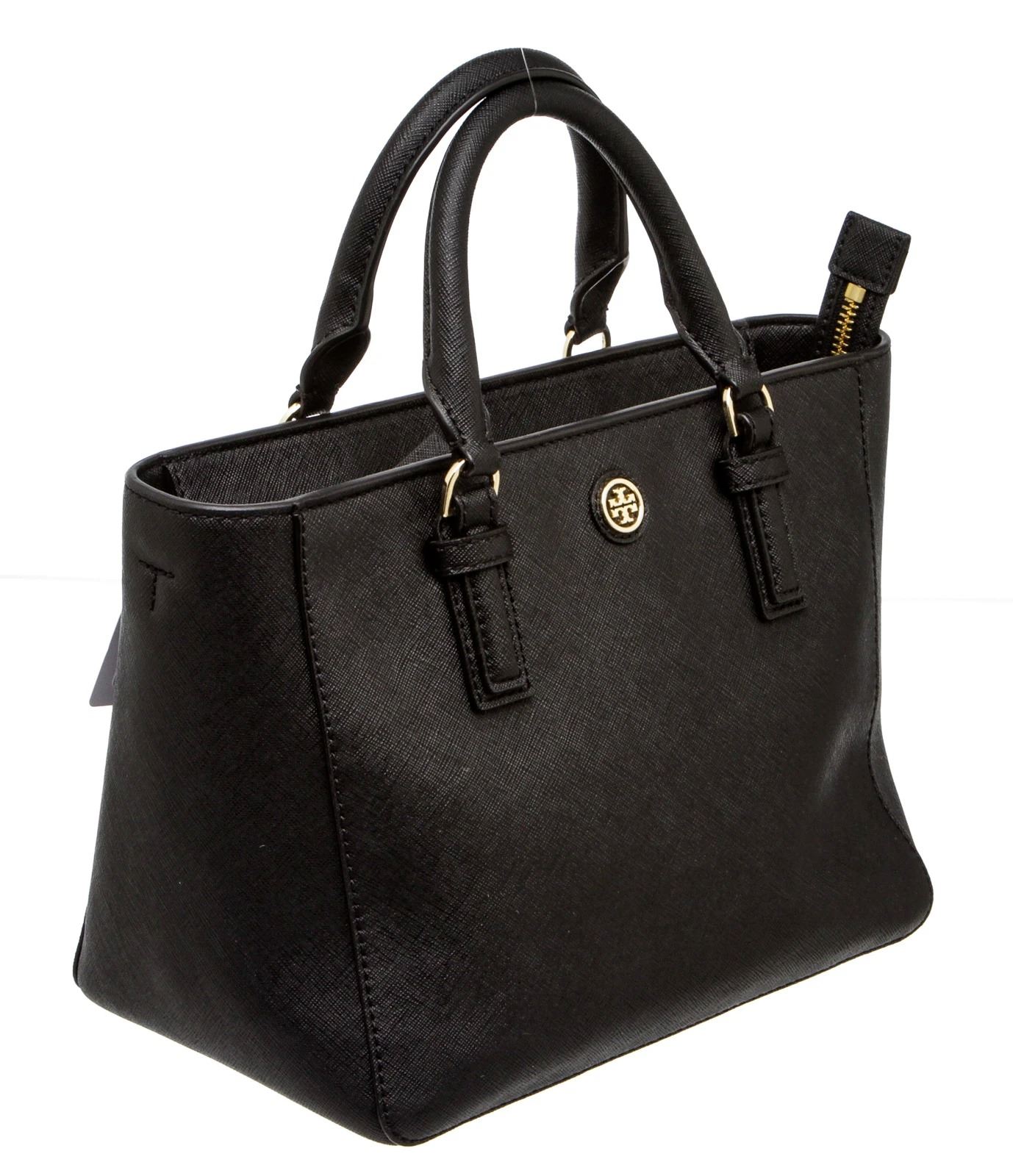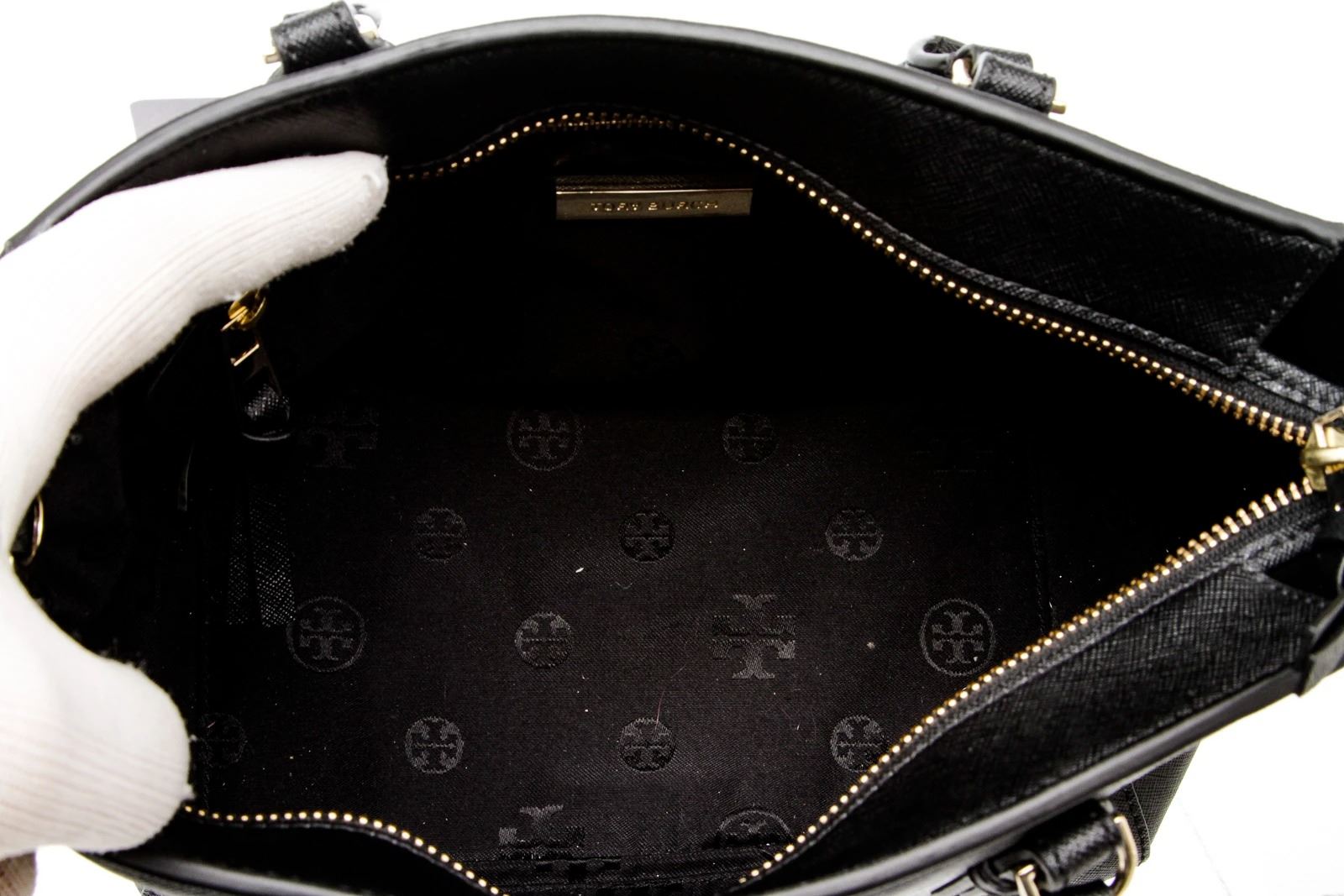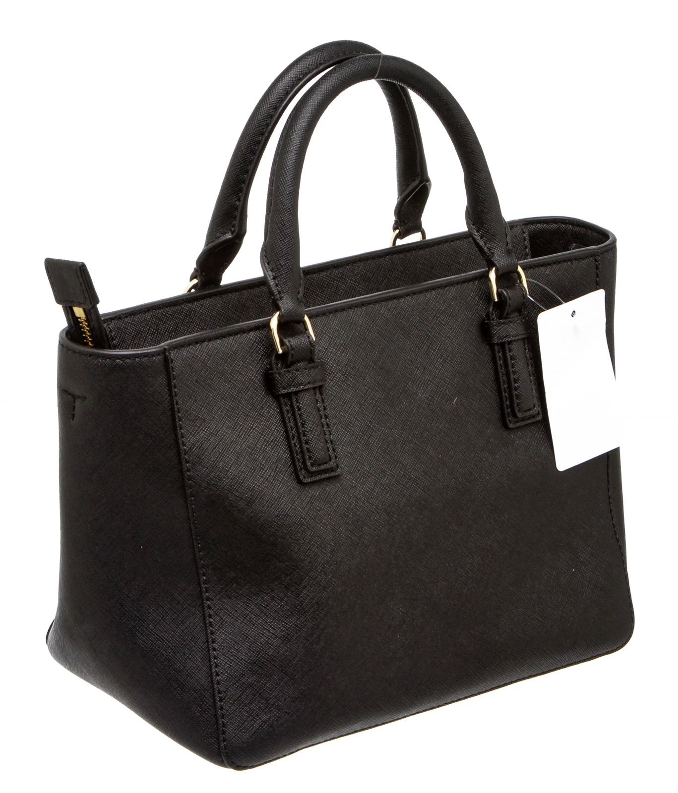 This Tory Burch black leather small satchel bag features two leather handles, zipper closure, single zip pocket on interior wall, one single slit pocket on opposite interior wall, one slit pocket with magnetic snap button closure, black fabric lining, and gold tone hardware.