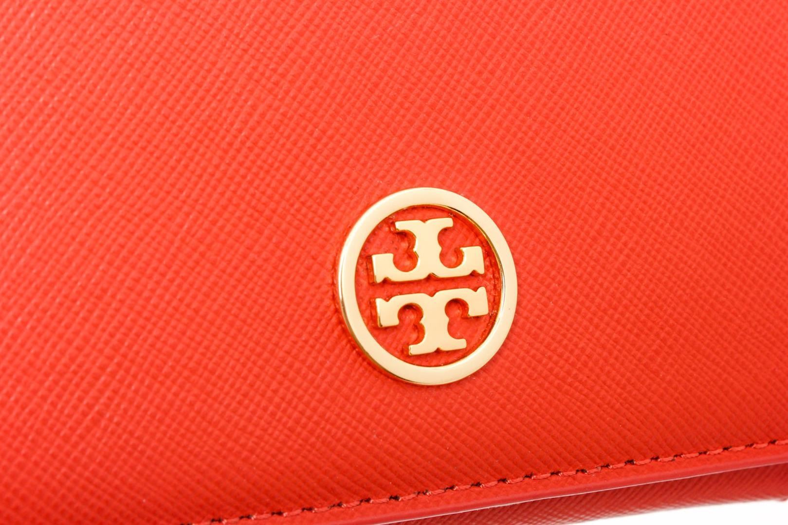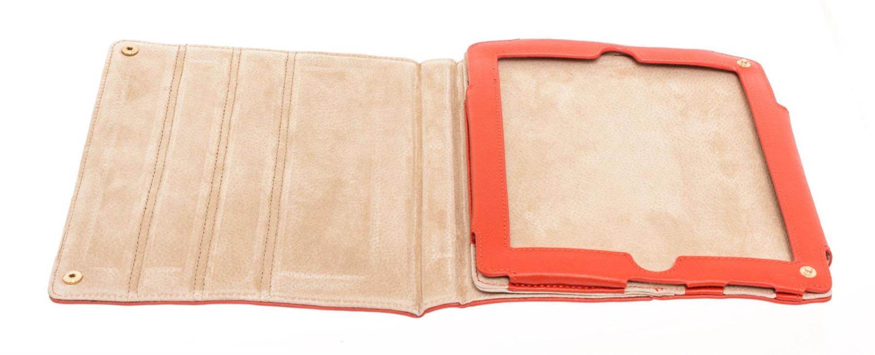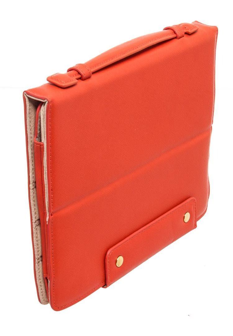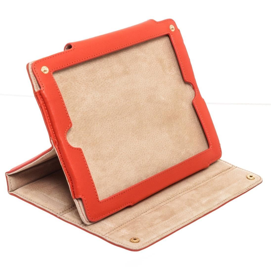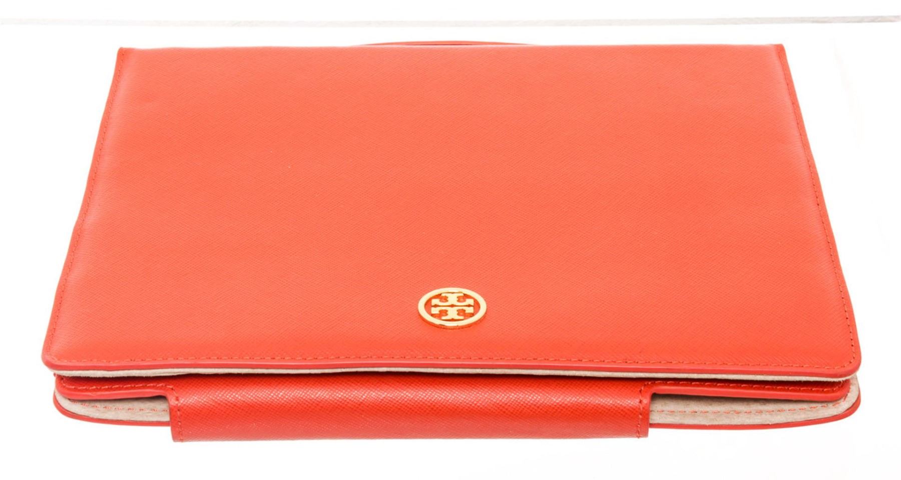 Tory Burch orange leather Robinson Flip tablet case with gold-tone hardware, logo placard at front, handle at top, tan suede interior lining with Ipad pocket holder and overall snap closure.