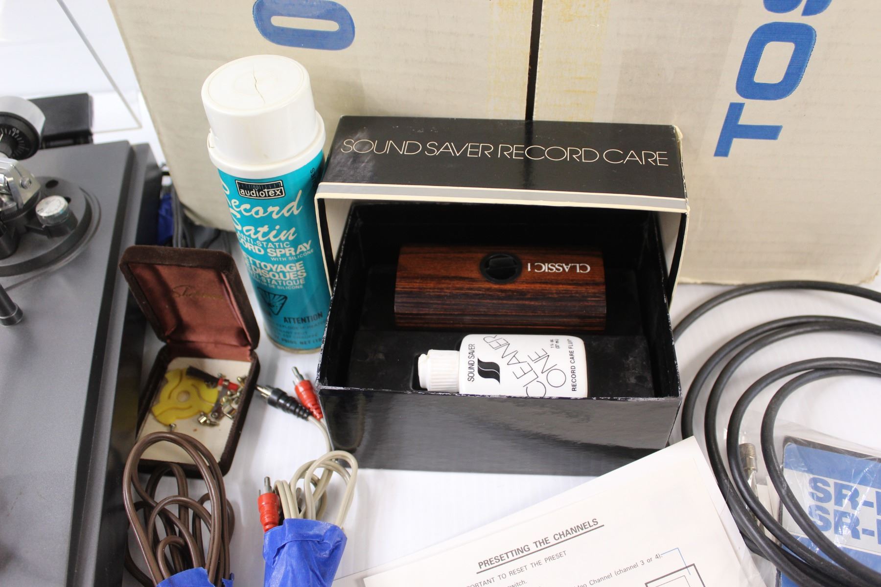 Toshiba SR-F100 Stereo Turntable (Powers Up) With Original Box & Owners Manual, Sound Saver Record Care Kit, Record Satin Spray, "Hooked on Classics" Philharmonic LP & Cords - Powers up, Drive Belt Off