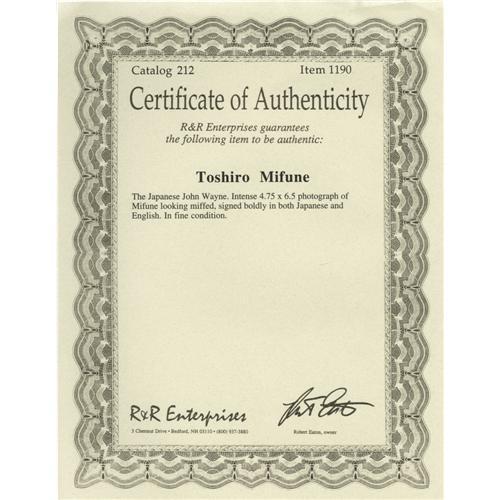 <B>Toshiro Mifune Signed Photo.</B></I> A wonderful 4.75" x 6.5" b&w photo of "the Japanese John Wayne" in period garb, signed boldly in both Japanese and English. In Excellent condition. <I>Accompanied by a certificate of authenticity.</B></I><BR><BR><b>Shipping:</b> Small Flat (<a target="_blank" href="http://www.heritageauctions.com/common/shipping.php">view shipping information</a>) <BR><BR><B>Important notice: