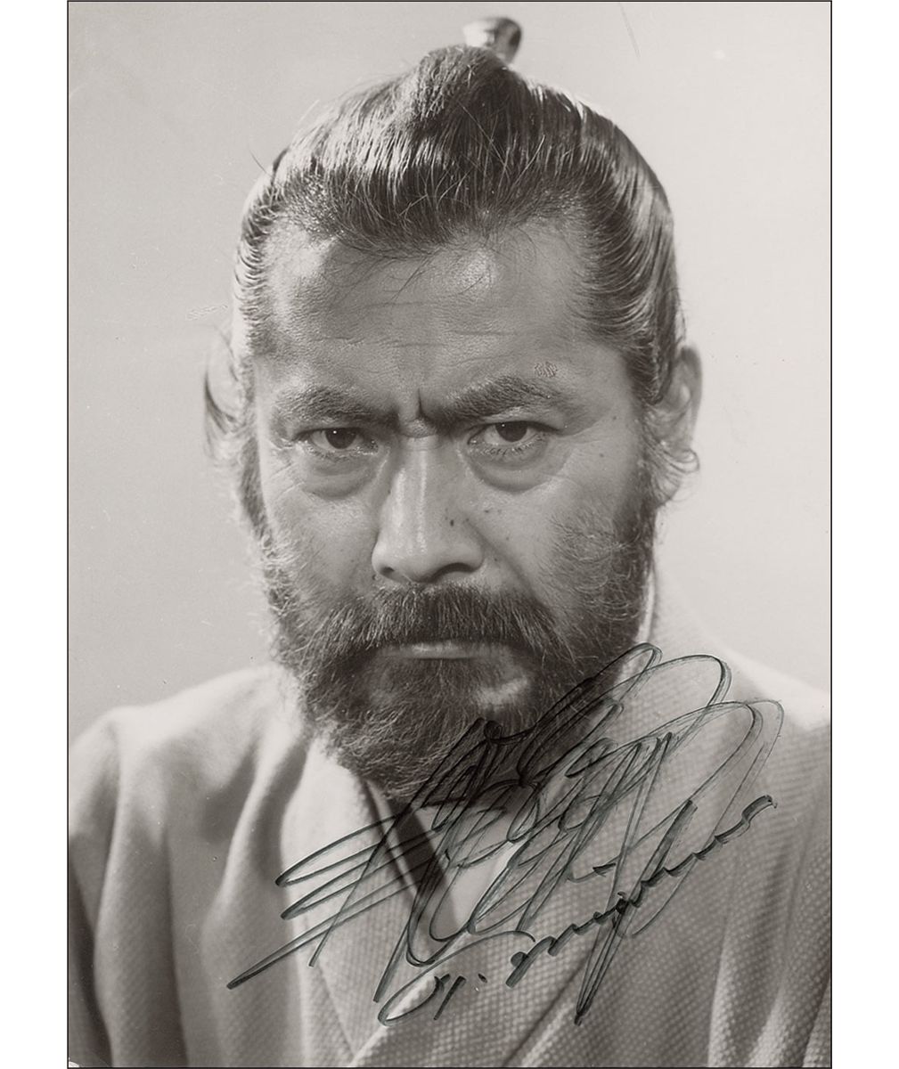 Intense semi-glossy 4.5 x 6.5 head-and-shoulders photo of Mifune as his famed character, Red Beard, boldly signed in black felt tip. In fine condition.