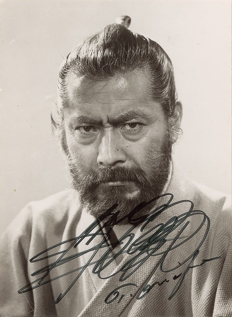Intense semi-glossy 4.5 x 6.5 head-and-shoulders photo of Mifune as his famed character, Red Beard, boldly signed in black felt tip. In fine condition. Accompanied by the original mailing envelope.