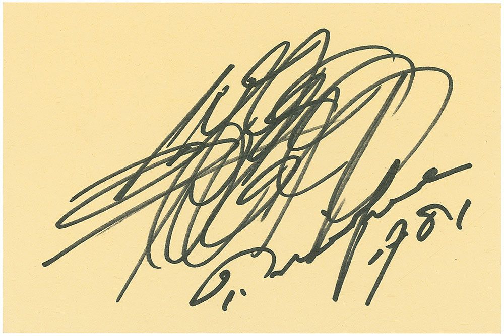Emphatic felt tip signature on a yellow 6 x 4 card, signed again at the bottom, “T. Mifune 1981.” In very fine condition.