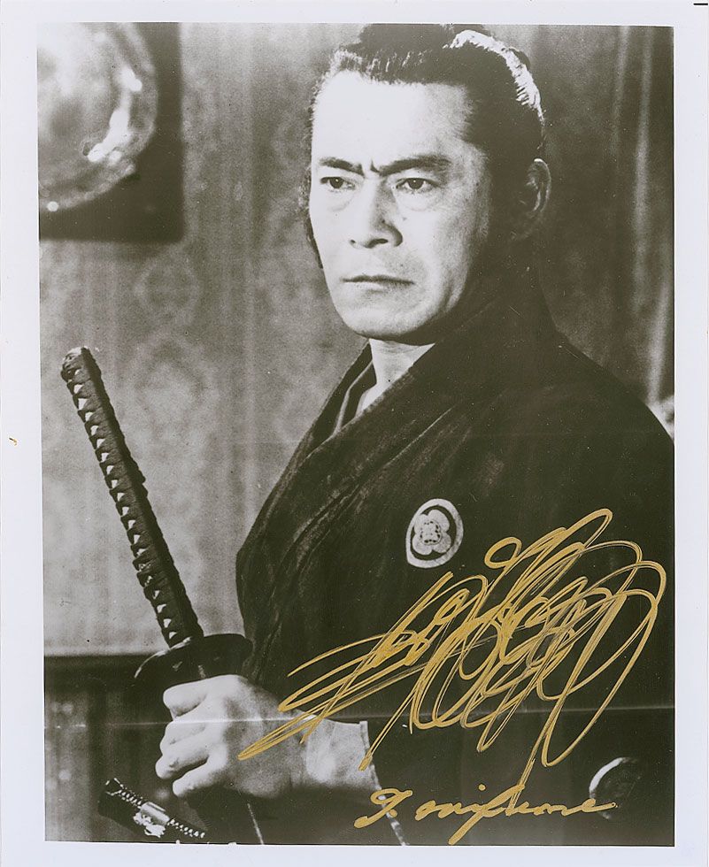 Glossy 8 x 10 photo of Mifune as a samurai, signed in gold ink, with Mifune printing “T. Mifune,” underneath. In fine condition, with a couple light edge creases.