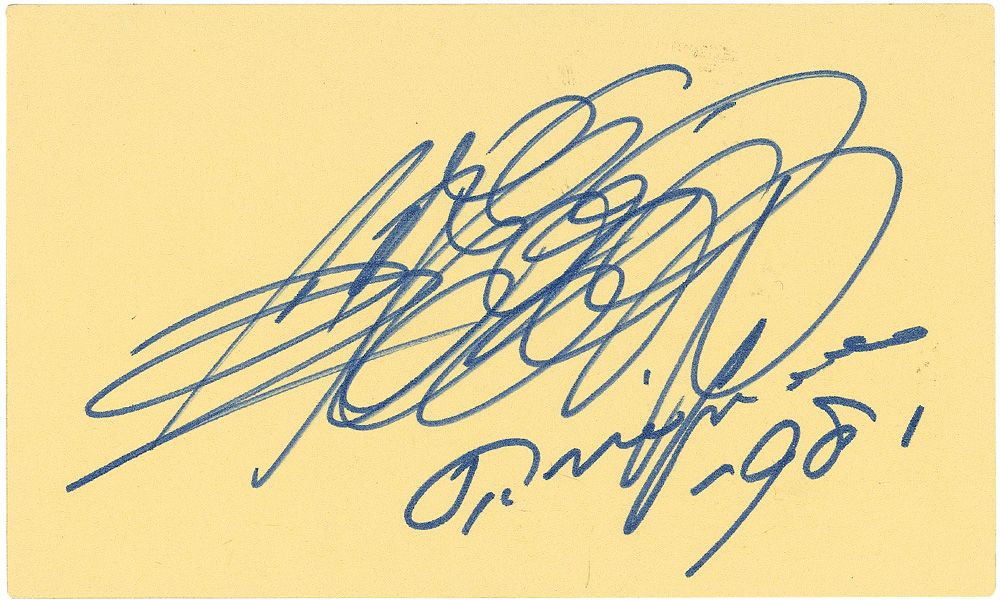 Elaborate felt tip signature on a yellow 5 x 3 card, and signed again in print, “T. Mifune 1981.” In fine condition.