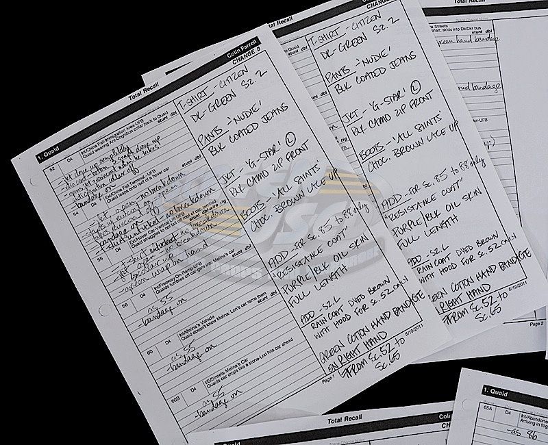 (Columbia Pictures, 2012) This outfit was acquired by the production for use by Colin Farrell as "Douglas Quaid". The outfit consists of a black camo jacket, shirt, pants and boots. The jacket is marked "Hero" on the inside. Included with the outfit are several production used costume continuity sheets that detail the entire outfit, change and scene numbers used.
