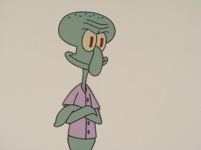 This original animation cel is from the Nickelodeon TV show SpongeBob Squarepants. The story takes place under the deep blue sea in Bikini Bottom, where SpongeBob resides. SpongeBob, who is a yellow, porous sponge, is your typical happy-go-lucky character, as he is always cheerful and enjoys making people laugh. Patrick Star, SpongeBob's neighbor is a starfish, who boasts knowingnothing and is often getting himself into ridiculous situations.Between the homes of these two lies the home of the miserable Squidward, a squid, who is known for being grouchy and playing tricks on SpongeBob and Patrick. Both SpongeBob and Squidward work at the Krusty Krab, a fast food business run by the greedy money-loving Mr. Krabs, a crab, the arch rival of the evil, possibly misunderstood, Plankton. Another neighbor, Sandy Cheeks, an athletic squirrel who normally wears an astronaut's space suit, was introduced in "Tea at the Treedome." She spends most of her time inventing and experimenting. It looks like Squidward has somebody's number; whoever it is, they are totally busted!Original Production Animated Cel Overall Size of Cel: 10 1/2" x 12 1/2" Excellent ConditionThis is an original hand-painted cel set-up used in the production of an episode of "SpongeBob SquarePants." Each one-of-a-kind set-up represents a slight change in position of the characters. When individually photographed and projected in rapid succession, the images appear to move.