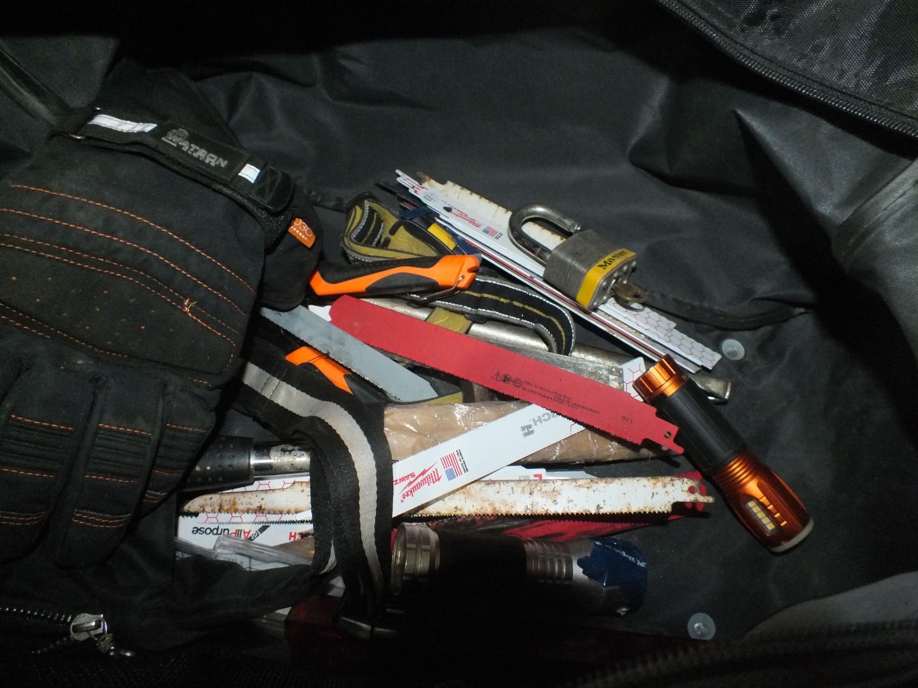 Tote Bag With Goodies, lots of Sawzall blades, flashlight and a hammer, rcmp theft recovery...used