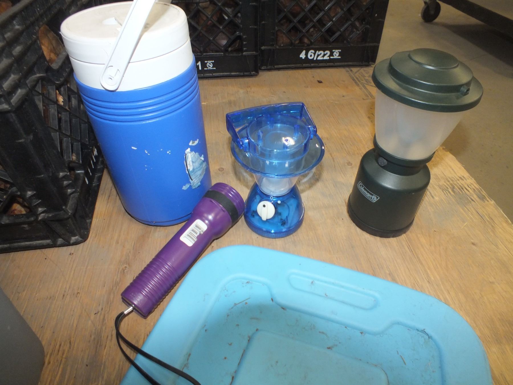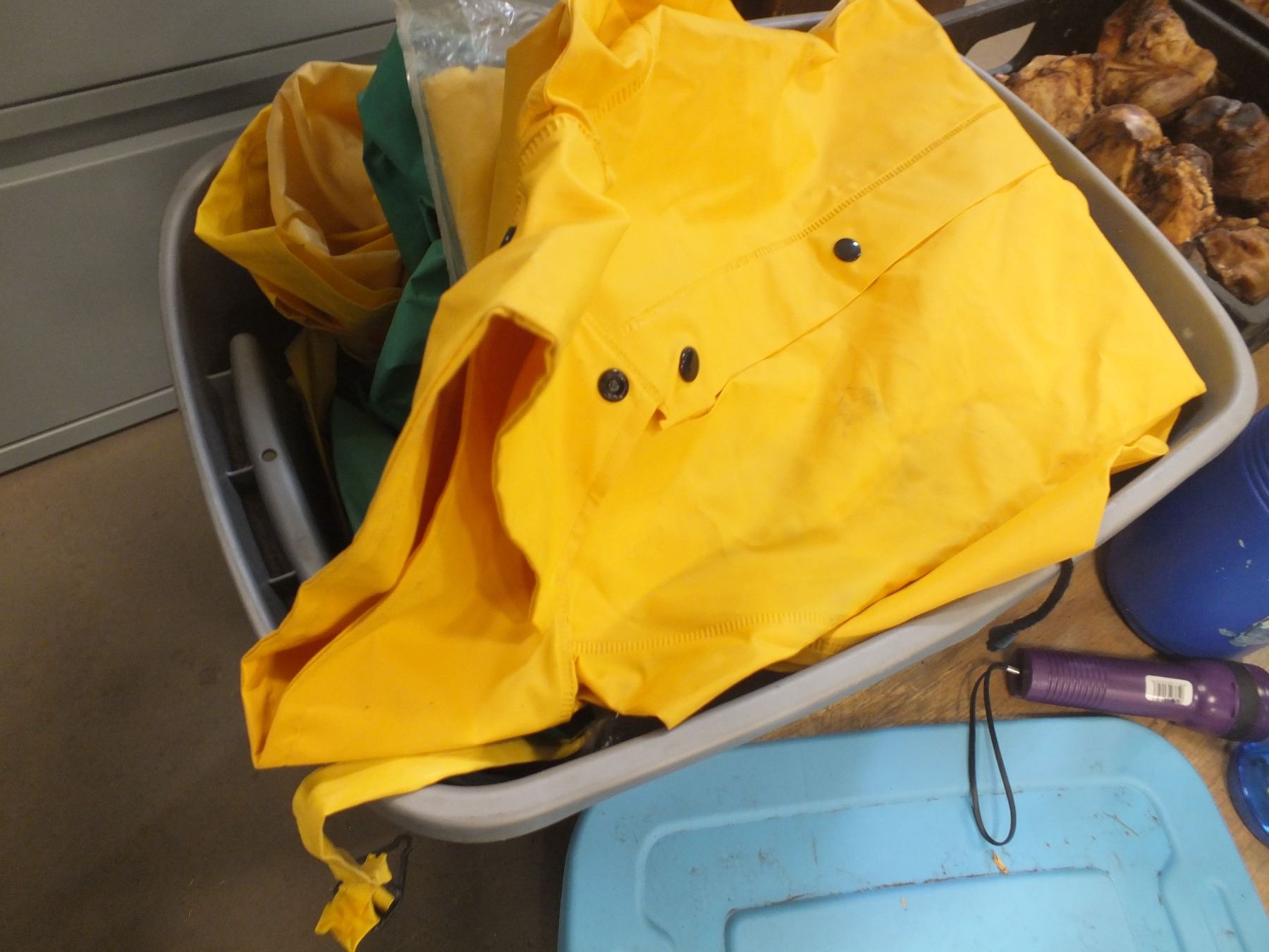 Tote Of Assorted Rain Gear & Camping Lights...used