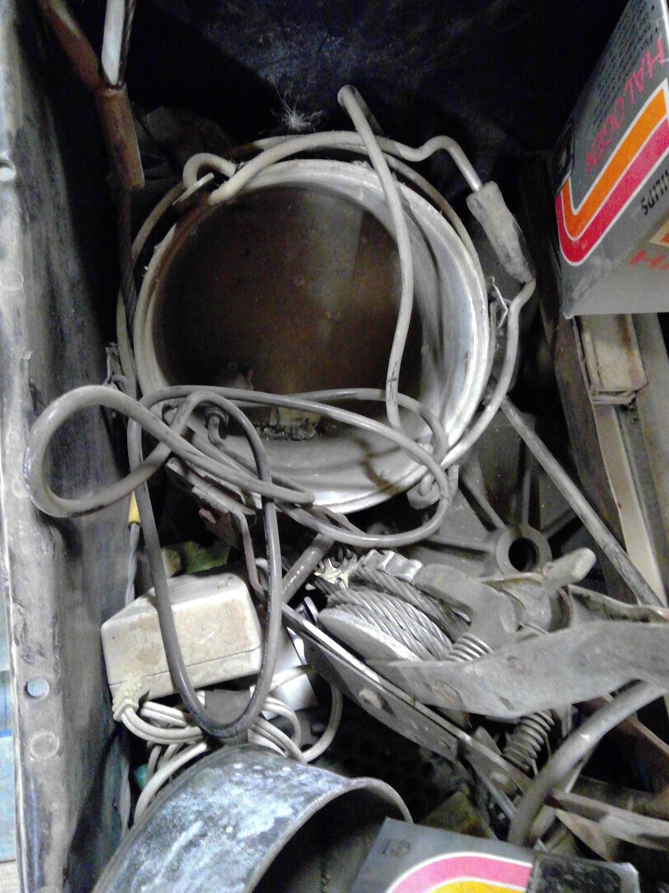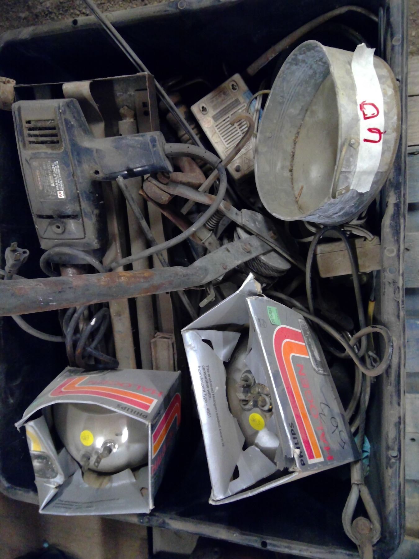 Tote of Misc items ( drill, headlights, come along, tools and misc.)