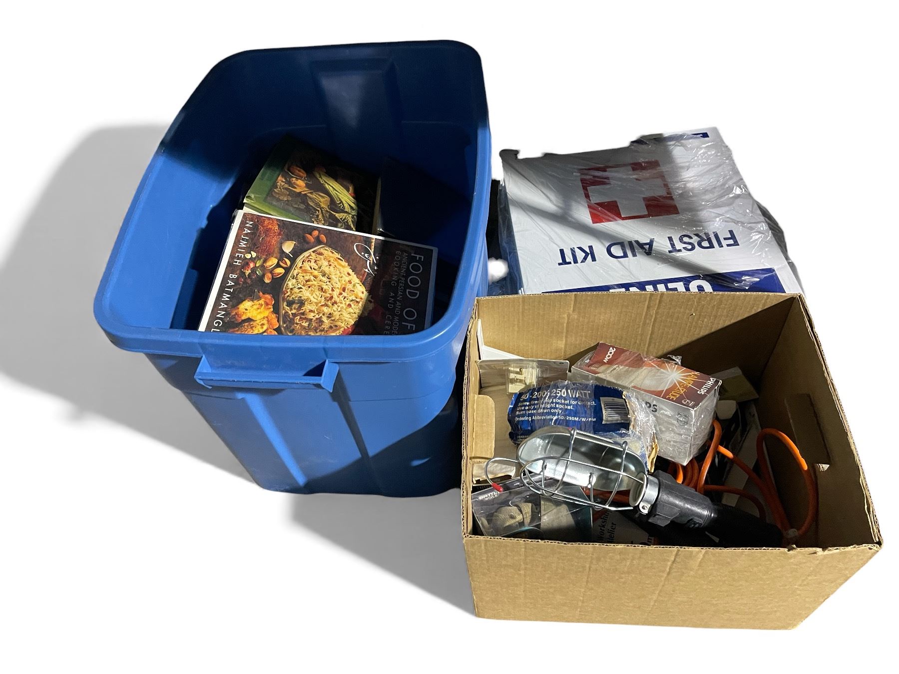 Tote with Assorted Cookbooks, Box of Utility Tools and Large First Aid Kit (Bins are NOT included)