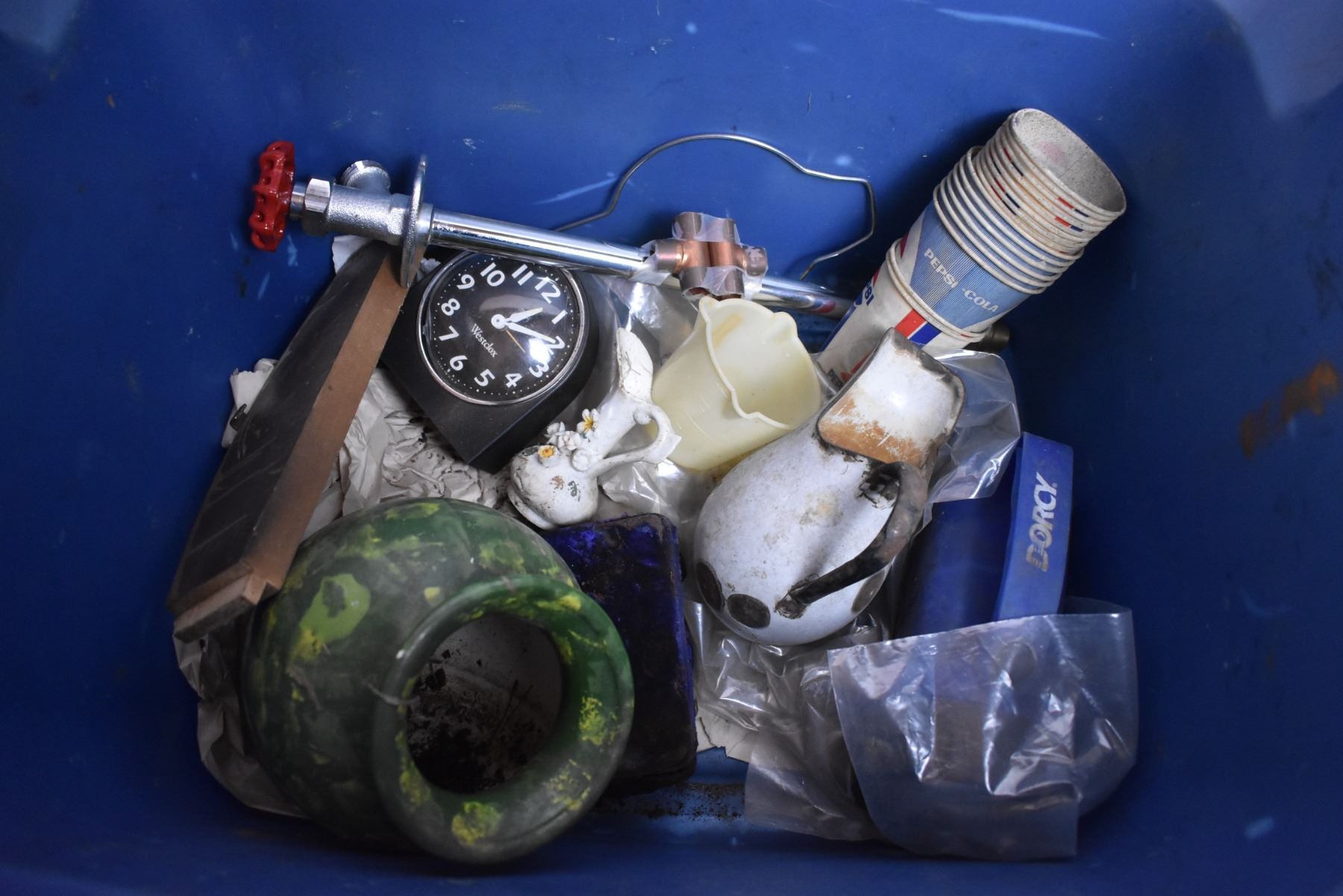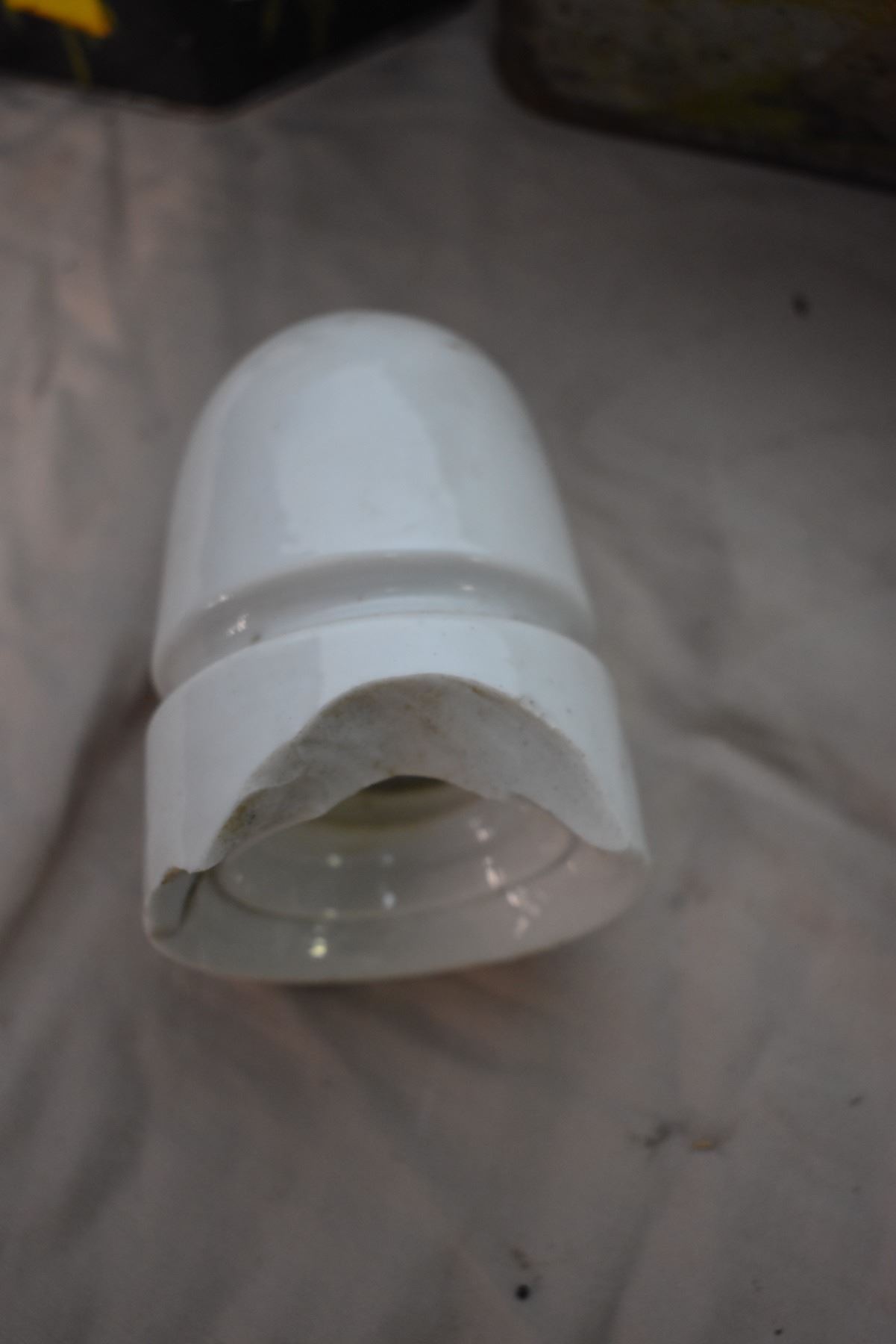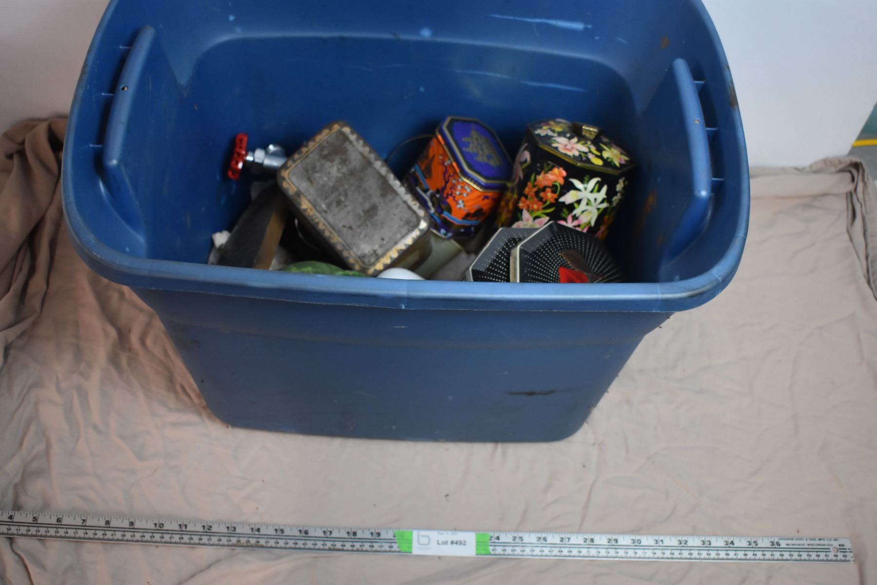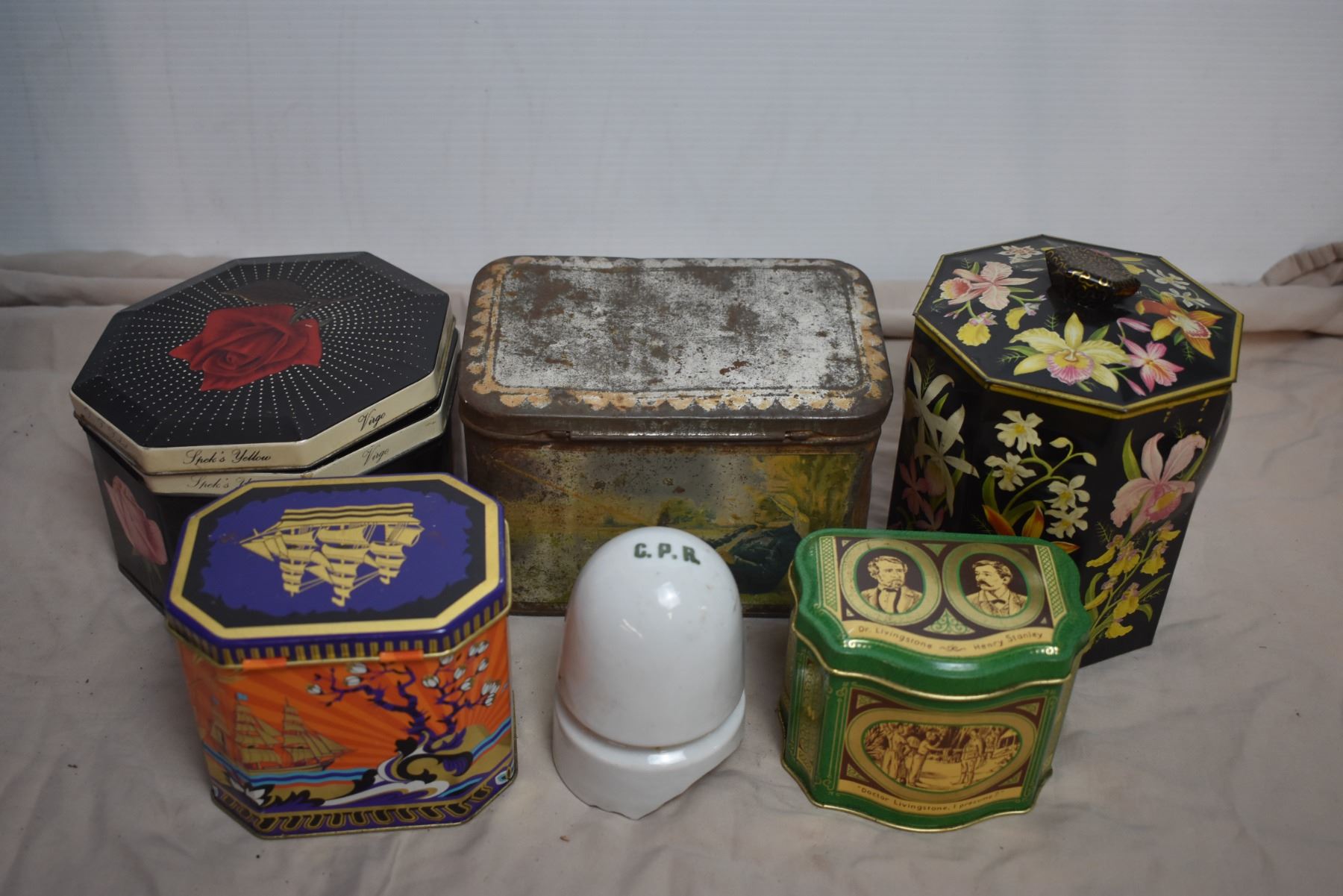 Tote with various collectable tins + CPR insulator (chipped) + various vases