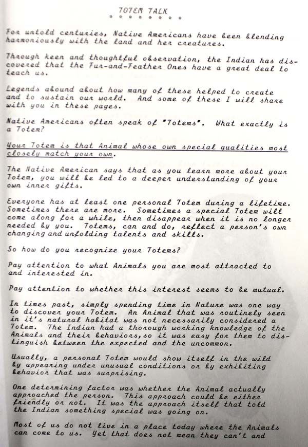 Totem Talk: Personal Application of Native American Teachings about Animals, softback booklet, 18 pages, typed stories