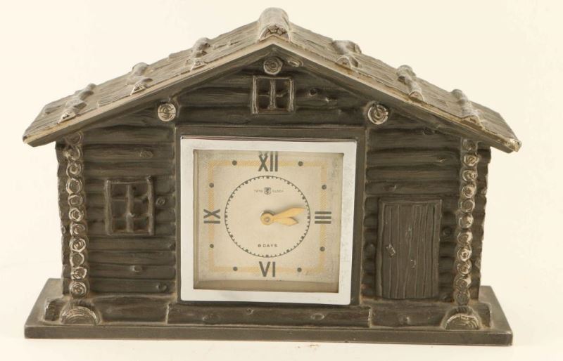Metal log cabin clock with silver metal face 8 1/2"X6". Self winding type.