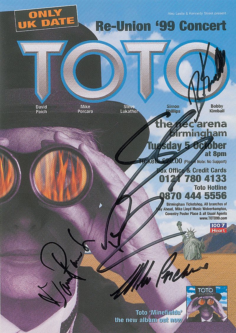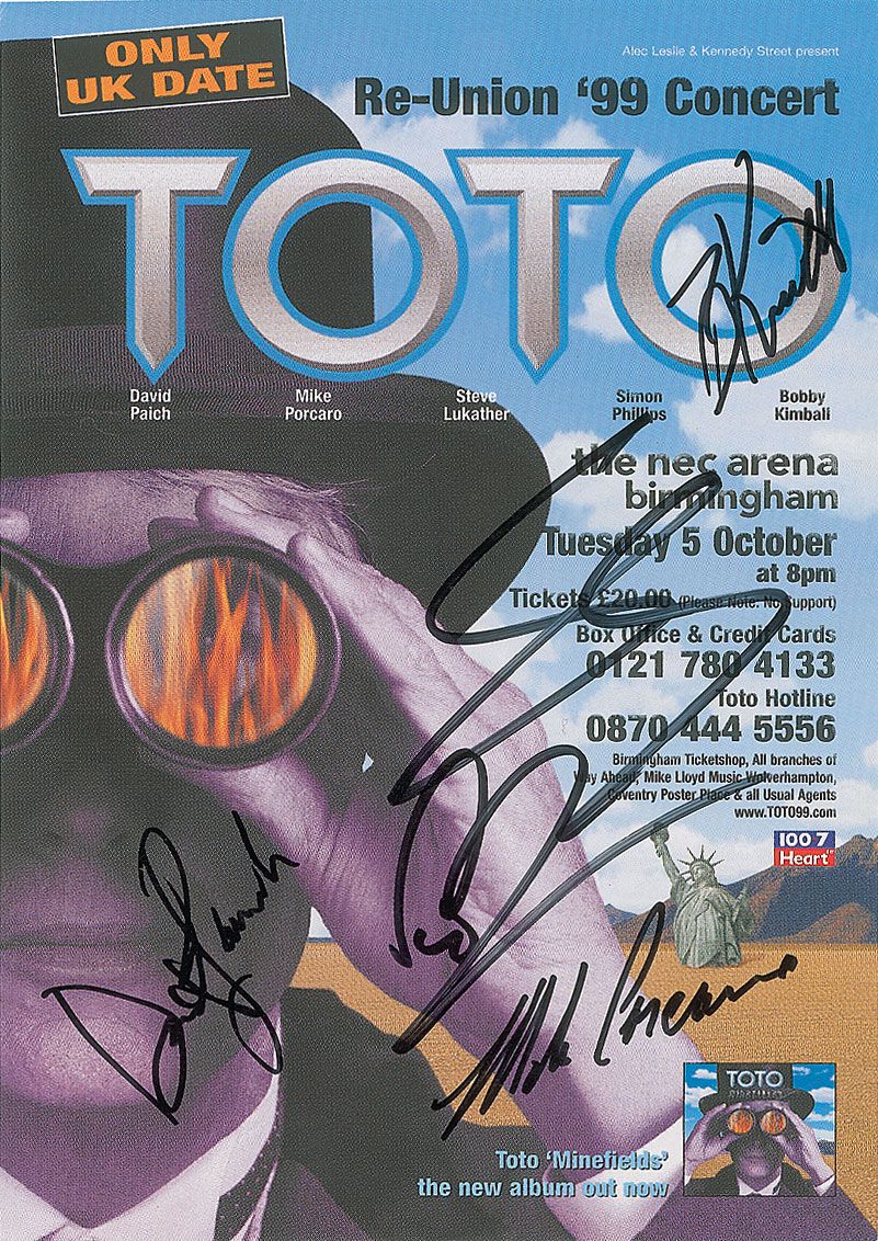 Two color promotional flyers for Toto’s UK Re-Union ’99 concert, 5.75 x 8, each signed in black felt tip by David Paich, Mike Porcaro, Steve Lukather, Simon Phillips, and Bobby Kimball. In very fine condition.