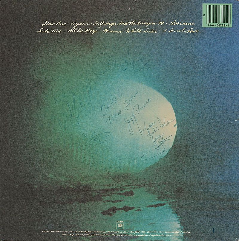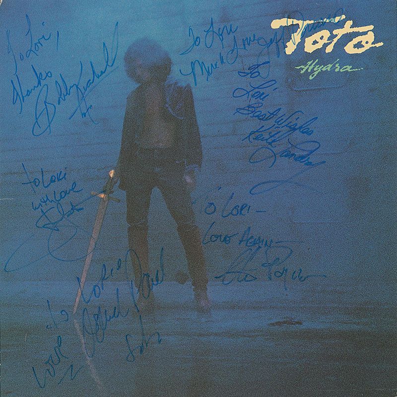 Hydra album signed and inscribed on the front cover in blue felt tip by Bobby Kimball, Steve Lukather, Keith Landry, David Paich, Jeff Porcaro, and Steve Porcaro, and signed and inscribed on the back cover in blue ballpoint by David Paich, Bobby Kimball, Keith Landry, Steve Lukather, and Jeff Porcaro. In fine condition. The record is included. Accompanied by a full letter of authenticity from Roger Epperson/REAL.