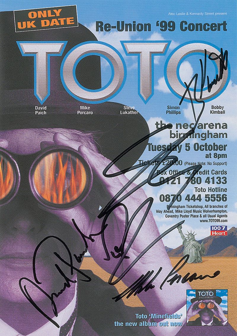 Color promotional flyer for the UK Re-Union ’99 Concert, 6 x 8.25, signed in black felt tip by David Paich, Mike Porcaro, Steve Lukather, Simon Phillips, and Bobby Kimball. In fine condition.