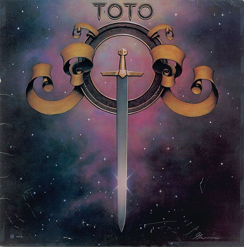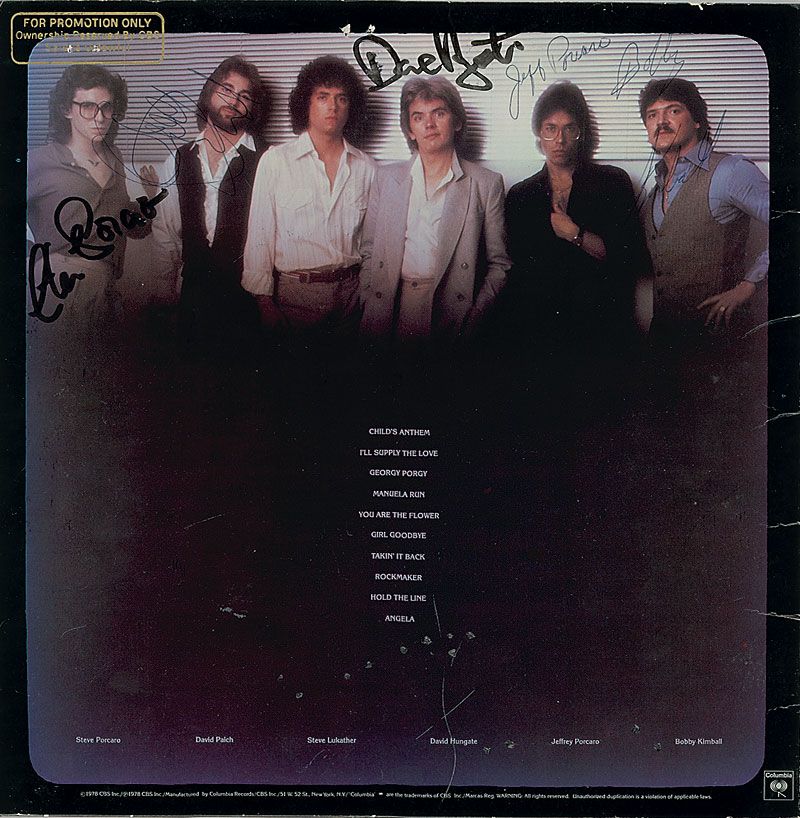 Toto promotional copy album signed on the back cover in blue ballpoint and black felt tip by Steve Porcaro, David Paich, David Hungate, Jeff Porcaro, and Bobby Kimball. In very good condition, with gold promotional stamp on back cover, scattered edge creasing, and surface marks and small holes to bottom portion of back cover. The record is included. Accompanied by a letter of authenticity from James Spence.