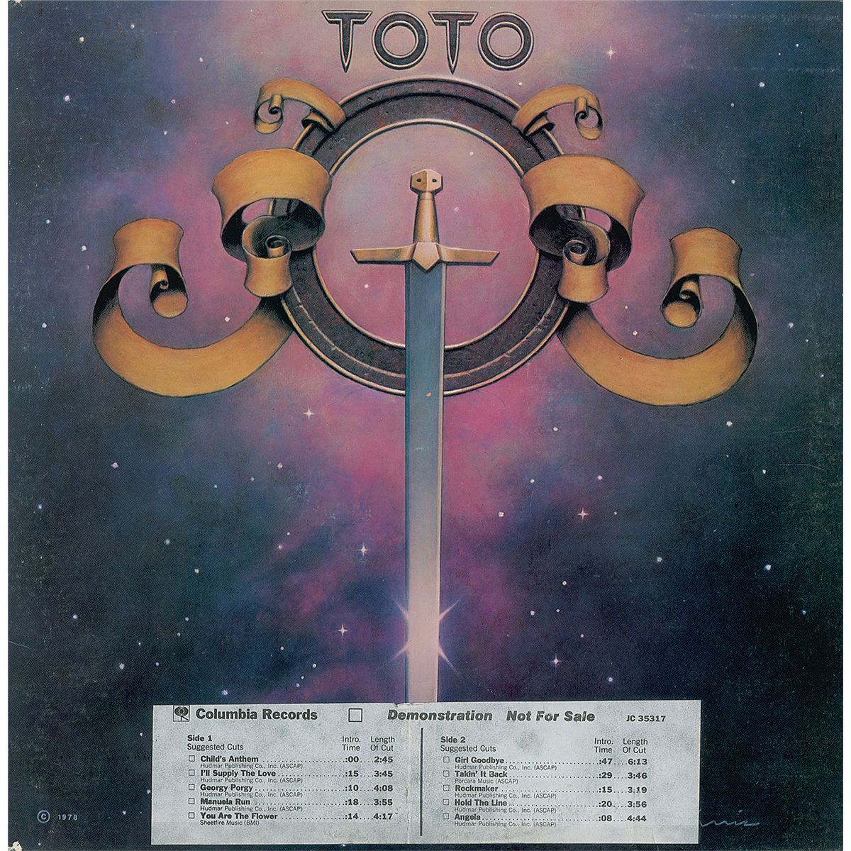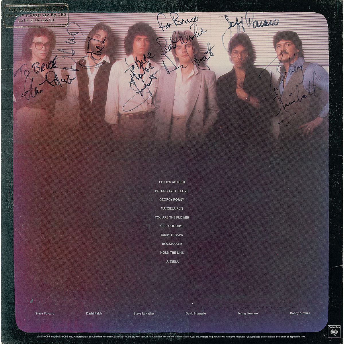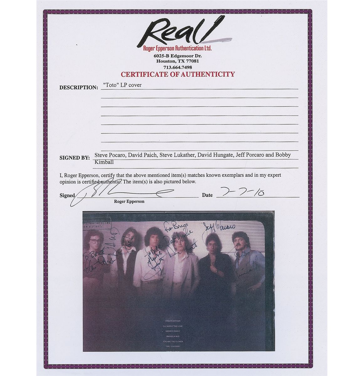 Self-titled album signed on the back cover in black felt tip by Steve Porcaro (ins), David Paich, Steve Lukather (ins), David Hungate (ins), Jeff Porcaro, and Bobby Kimball. In fine condition, with a gold promotional stamp to back cover and a demonstration label to front cover. The record is not included. Accompanied by a full letter of authenticity from Roger Epperson/REAL.