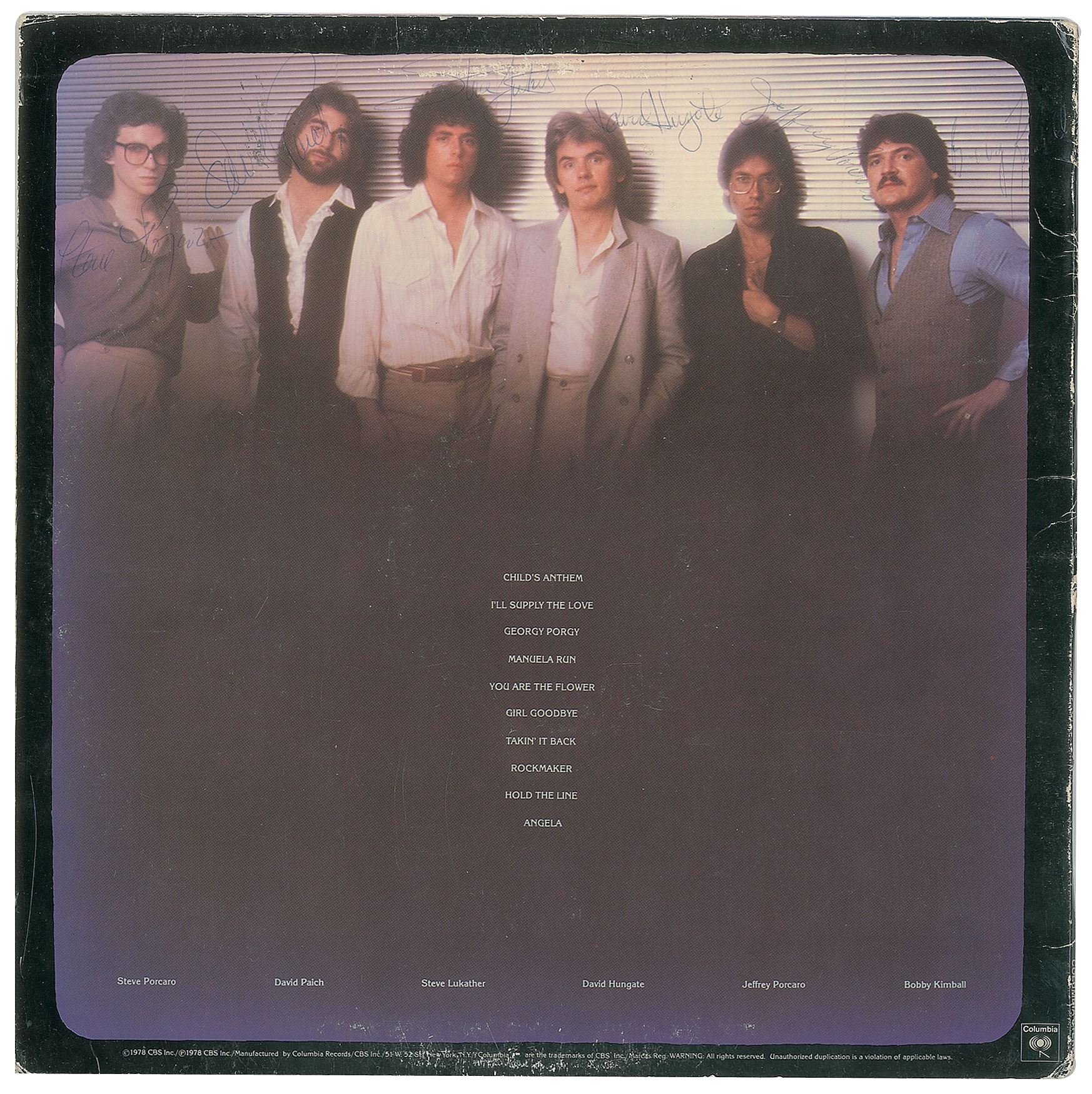 Self-titled debut album from Toto, signed above their back cover images in ballpoint by Bobby Kimball, Steve Lukather, David Paich, Steve Porcaro, David Hungate, and Jeff Porcaro. In fine condition, with some light scuffing. The record is included. This is the first time we have ever offered this album with all the original members with uninscribed signatures.