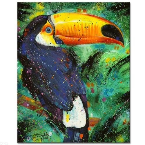 With bright colors and expressive lines, Stephen Fishwick puts a unique spin on pop culture portraits. "Toucan" is a limited edition giclee on stretched canvas, numbered and bears the artist's authorized signature. This piece comes gallery wrapped and ready to hang! Includes Certificate of Authenticity! Measures approx. 16" x 20" (image).