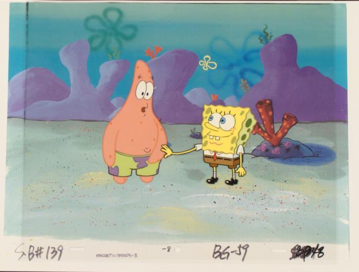 This animation cel and reproduction background are from the Nickelodeon TV show SpongeBob Squarepants. The story takes place under the deep blue sea in Bikini Bottom, where SpongeBob resides. SpongeBob, who is a yellow, porous sponge, is your typical happy-go-lucky character, as he is always cheerful and enjoys making people laugh. Patrick Star, SpongeBob's neighbor who is a starfish, is your average children's show idiot, as he boasts knowing nothing and is often getting himself into ridiculous situations. Between the homes of these two lies the home of the miserable Squidward, a squid, who is known for being grouchy and playing tricks on SpongeBob and Patrick. Both SpongeBob and Squidward work at the Krusty Krab, a fast food business run by the greedy money-loving Mr. Krabs, a crab, the arch rival of the evil, possibly misunderstood, Plankton. Another neighbor, Sandy Cheeks, an athletic squirrel who normally wears an astronaut's space suit, was introduced in "Tea at the Treedome." She spends most of her time inventing and experimenting. SpongeBob seems to be touching Patrick's belly.Original Printed Background and Animated Cel Overall Size of Background: 11" x 17" Overall Size of the Cel: 10 1/2" x 12 1/2" Very good condition This is an original hand-painted cel set-up used in the production of an episode of "SpongeBob SquarePants." Each one-of-a-kind set-up represents a slight change in position of the characters. When individually photographed and projected in rapid succession, the images appear to move.