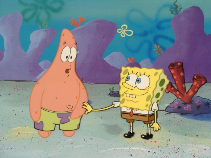 This animation cel and reproduction background are from the Nickelodeon TV show SpongeBob Squarepants. The story takes place under the deep blue sea in Bikini Bottom, where SpongeBob resides. SpongeBob, who is a yellow, porous sponge, is your typical happy-go-lucky character, as he is always cheerful and enjoys making people laugh. Patrick Star, SpongeBob's neighbor who is a starfish, is your average children's show idiot, as he boasts knowing nothing and is often getting himself into ridiculous situations. Between the homes of these two lies the home of the miserable Squidward, a squid, who is known for being grouchy and playing tricks on SpongeBob and Patrick. Both SpongeBob and Squidward work at the Krusty Krab, a fast food business run by the greedy money-loving Mr. Krabs, a crab, the arch rival of the evil, possibly misunderstood, Plankton. Another neighbor, Sandy Cheeks, an athletic squirrel who normally wears an astronaut's space suit, was introduced in "Tea at the Treedome." She spends most of her time inventing and experimenting. SpongeBob seems to be touching Patrick's belly.Original Printed Background and Animated Cel Overall Size of Background: 11" x 17" Overall Size of the Cel: 10 1/2" x 12 1/2" Very good condition This is an original hand-painted cel set-up used in the production of an episode of "SpongeBob SquarePants." Each one-of-a-kind set-up represents a slight change in position of the characters. When individually photographed and projected in rapid succession, the images appear to move.
