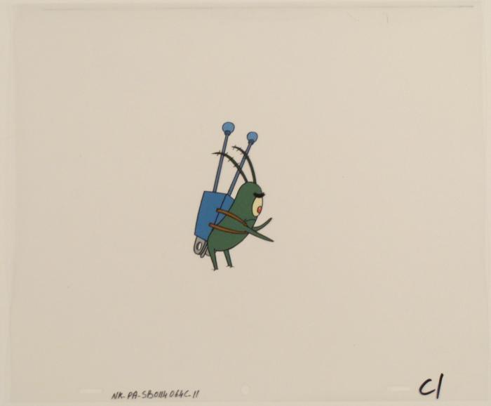 This original animation cel is from the Nickelodeon TV show SpongeBob Squarepants. The story takes place under the deep blue sea in Bikini Bottom, where SpongeBob resides. SpongeBob, who is a yellow, porous sponge, is your typical happy-go-lucky character, as he is always cheerful and enjoys making people laugh. Patrick Star, SpongeBob's neighbor who is a starfish, is your average children's show idiot, as he boasts knowing nothing and is often getting himself into ridiculous situations. Between the homes of these two lies the home of the miserable Squidward, a squid, who is known for being grouchy and playing tricks on SpongeBob and Patrick. Both SpongeBob and Squidward work at the Krusty Krab, a fast food business run by the greedy money-loving Mr. Krabs, a crab, the arch rival of the evil, possibly misunderstood, Plankton. Another neighbor, Sandy Cheeks, an athletic squirrel who normally wears an astronaut's space suit, was introduced in "Tea at the Treedome." She spends most of her time inventing and experimenting. Plankton looks like he is touching something.Original Production Animated Cel Overall Size of Cel: 10 1/2" x 12 1/2" Very Good ConditionThis is an original hand-painted cel set-up used in the production of an episode of "SpongeBob SquarePants." Each one-of-a-kind set-up represents a slight change in position of the characters. When individually photographed and projected in rapid succession, the images appear to move.