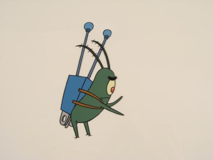 This original animation cel is from the Nickelodeon TV show SpongeBob Squarepants. The story takes place under the deep blue sea in Bikini Bottom, where SpongeBob resides. SpongeBob, who is a yellow, porous sponge, is your typical happy-go-lucky character, as he is always cheerful and enjoys making people laugh. Patrick Star, SpongeBob's neighbor who is a starfish, is your average children's show idiot, as he boasts knowing nothing and is often getting himself into ridiculous situations. Between the homes of these two lies the home of the miserable Squidward, a squid, who is known for being grouchy and playing tricks on SpongeBob and Patrick. Both SpongeBob and Squidward work at the Krusty Krab, a fast food business run by the greedy money-loving Mr. Krabs, a crab, the arch rival of the evil, possibly misunderstood, Plankton. Another neighbor, Sandy Cheeks, an athletic squirrel who normally wears an astronaut's space suit, was introduced in "Tea at the Treedome." She spends most of her time inventing and experimenting. Plankton looks like he is touching something.Original Production Animated Cel Overall Size of Cel: 10 1/2" x 12 1/2" Very Good ConditionThis is an original hand-painted cel set-up used in the production of an episode of "SpongeBob SquarePants." Each one-of-a-kind set-up represents a slight change in position of the characters. When individually photographed and projected in rapid succession, the images appear to move.