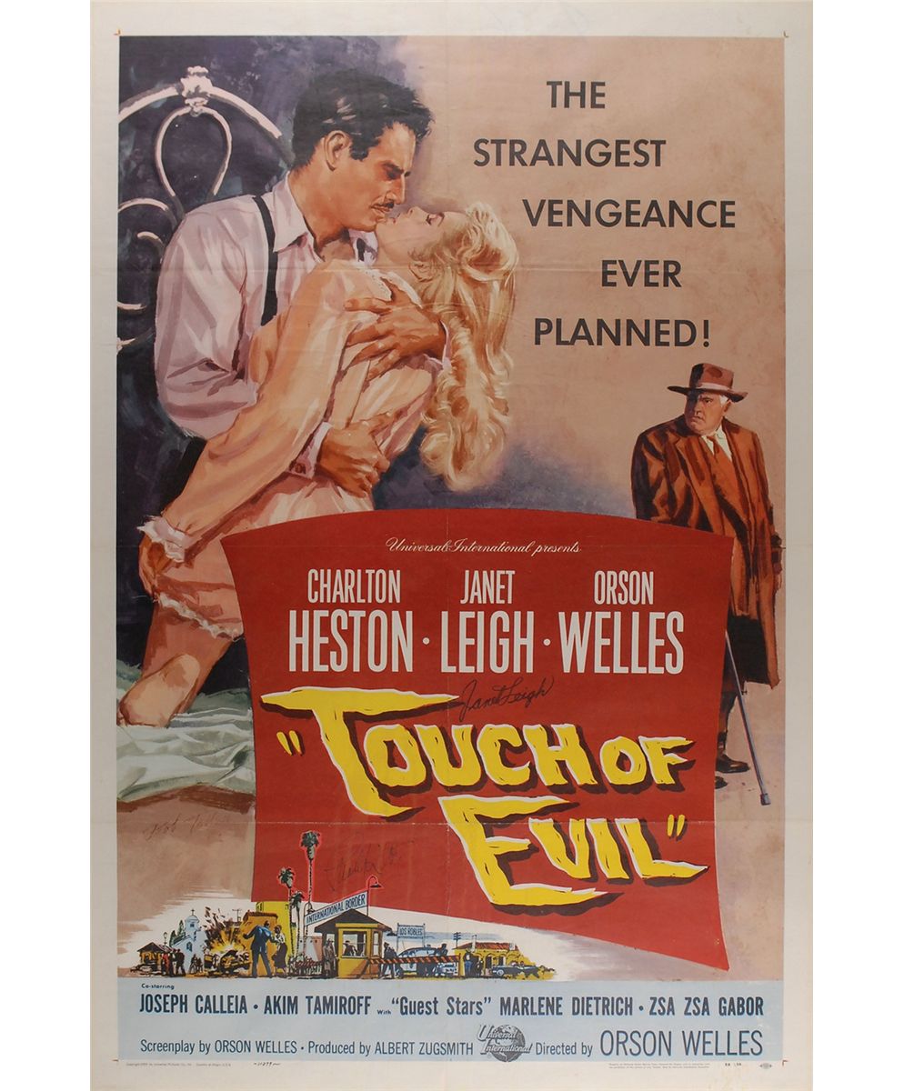 Color 27 x 41 one-sheet poster for the 1958 film Touch of Evil, signed in black felt tip by Charlton Heston and Janet Leigh. Poster has been linen-backed. In fine condition, with previous storage folds and some light show-through from a notation along reverse top edge. Rolled. From the collection of noted publisher and founder of Lord John Press, Herb Yellin.
