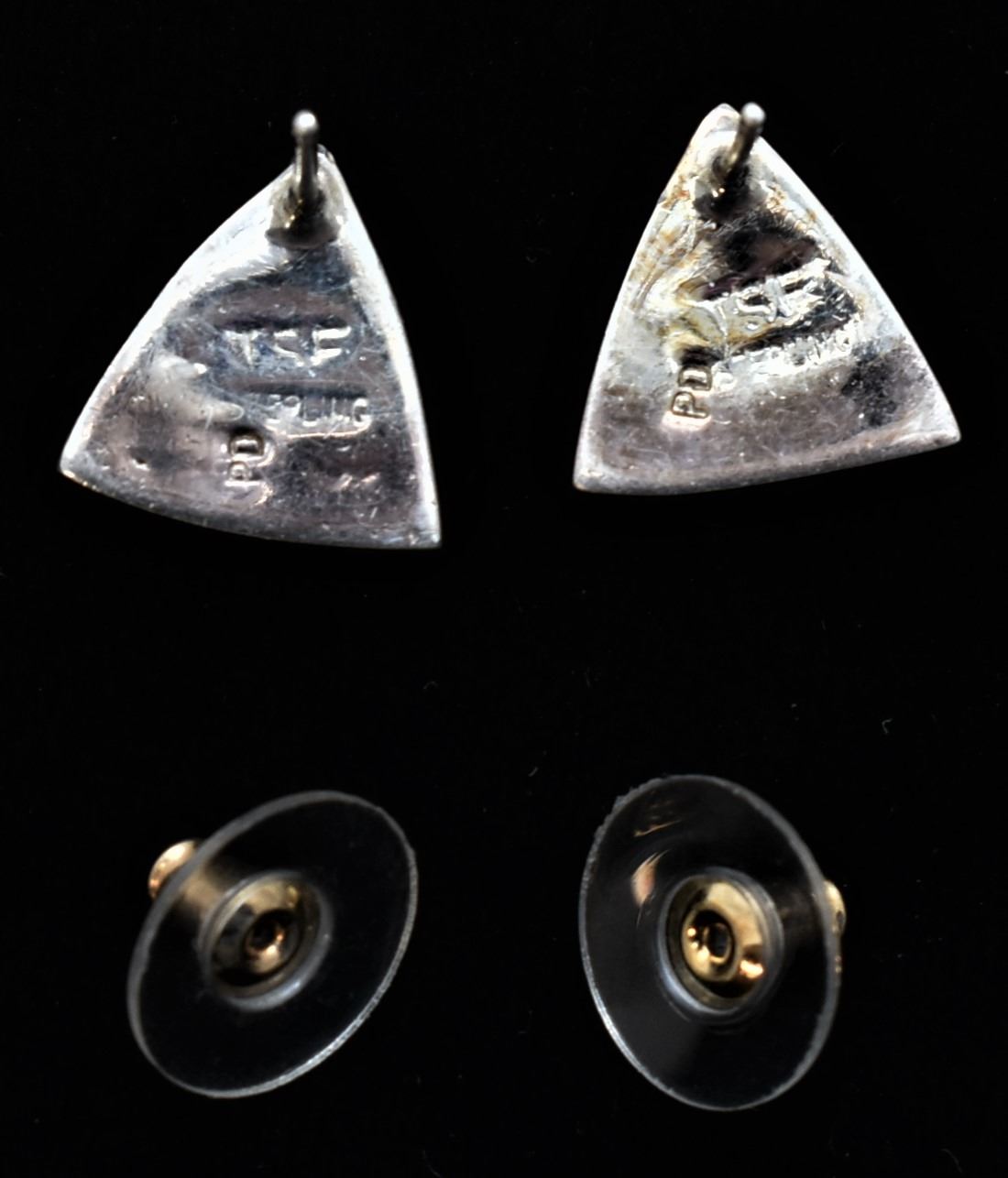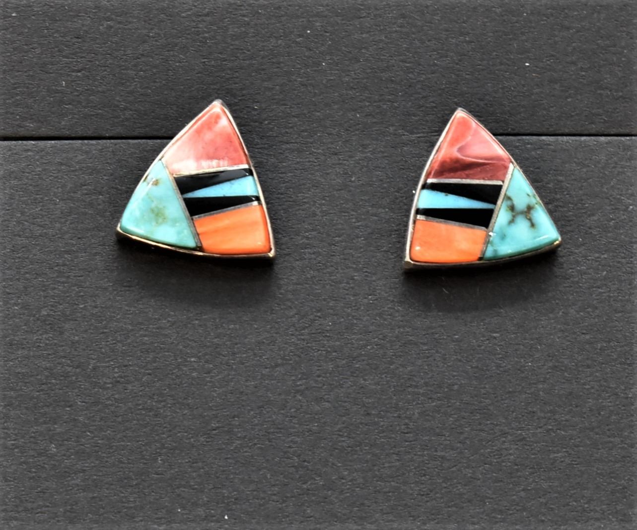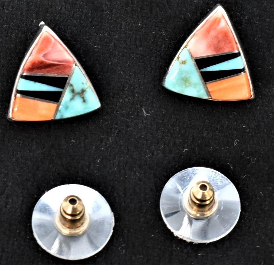 Touch of Santa Fe Native American Navajo Sterling Inlay Post Earrings, measure .5'' x .5'' and have the shop hallmark TSF on back along with the artist's initials PD, beautiful inlay of red shell, turquoise, and jet