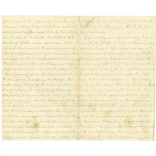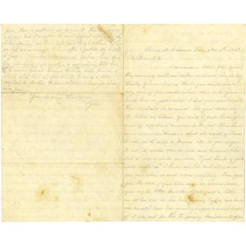<B>Touching Civil War Letter to Wife.</B></I> One page, 9.5" x 7.75", Camp at Leinors, Tennessee, November 1, 1863. Wonderful letter containing lovely personal emotion as well as substantive military content. The soldier reassures his wife that their marriage can withstand the <I>"trials and dis-/sapointments [sic] in this world"</B></I>, and that, were it not "<I>for the temperary [sic] banishment from/ you I would be the happiest of husbands."</B></I> He also tells his wife of the various close-calls that he and his regiment have encountered, acknowledging that, though he is confused, <I>"Gen. Burnside probably knows what he is about."</B></I> Letter is in good condition, exhibiting minor foxing, creases from mailing.<BR><BR><b>Shipping:</b> Flat Material, Small (<a target="_blank" href="http://www.heritageauctions.com/common/shipping.php">view shipping information</a>)