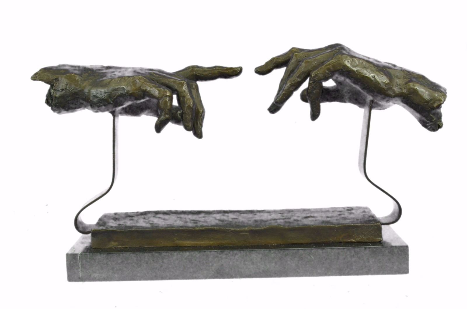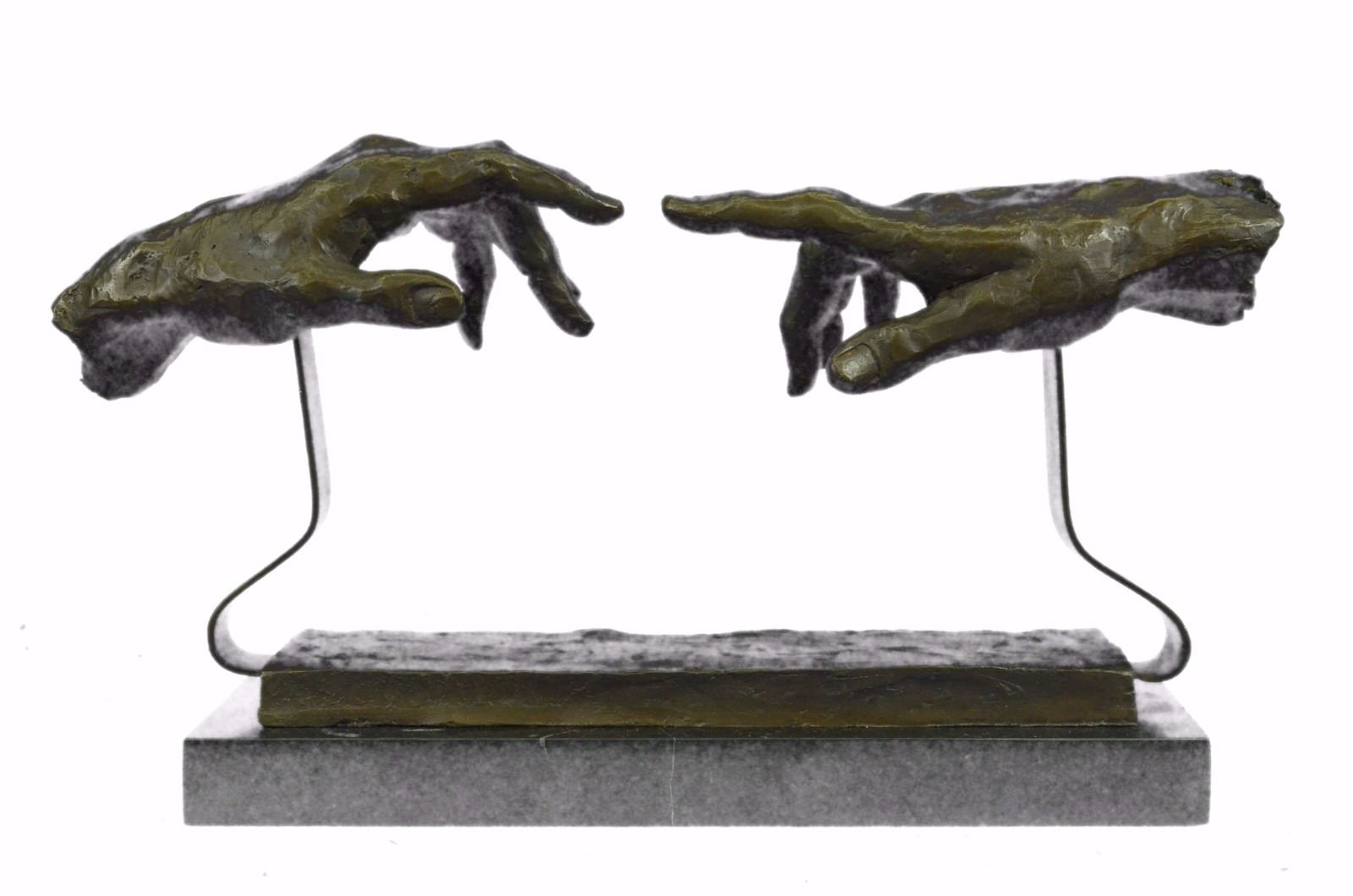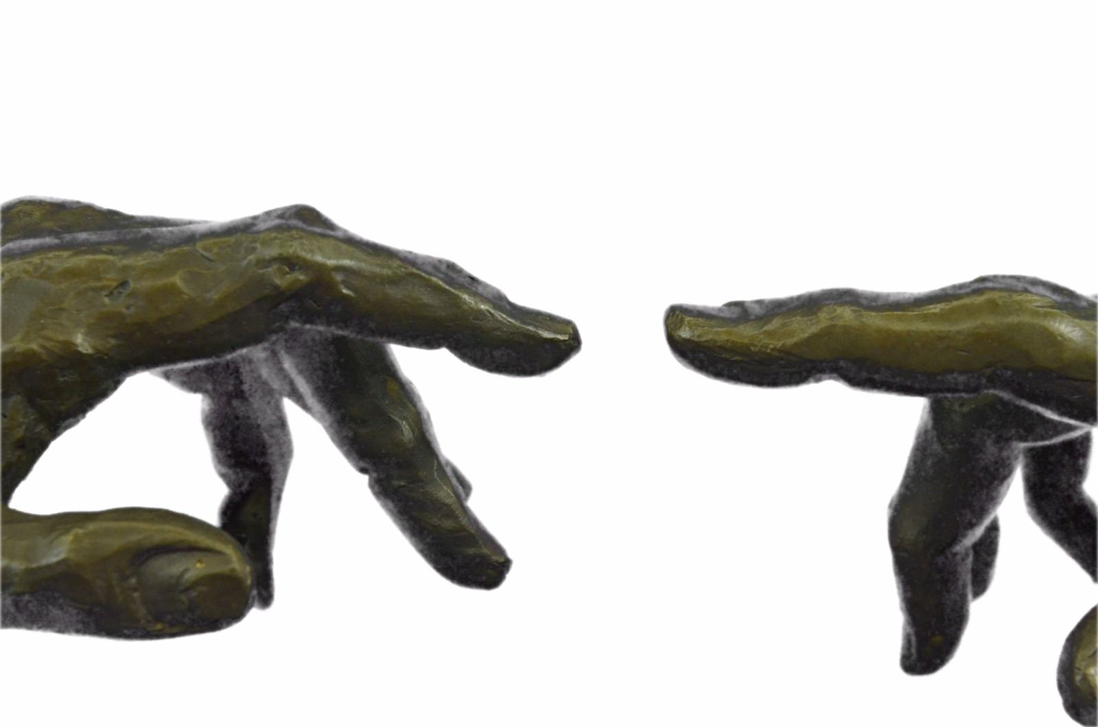 This Is A Unique Representation Of The Famous Artist, Michelangelo'S Painting, The Creation Of Adam. The Painting Is A Section Of Michelangelo'S Fresco Sistine Chapel Ceiling Painted Circa 1511. It Illustrates The Biblical Story From The Book Of Genesis In Which God The Father Breathes Life Into Adam, The First Man. Our Artist Has Transformed This Historic Painting Into An Abstract 3-D Form. Only Nine Of These Pieces Were Carefully Hand Crafted, Resting On A Solid Black Marble Base. Bronze Dimensions With Marble Base: Height 9 X Width 18 inches. Weight: 12 Lbs. Please Note: This is a reproduction bronze sculpture from the original molded and signed. This featured bronze sculpture is a recast after the original, and has been done recently. This 100% bronze sculpture is an abstract piece certain to be a conversation piece.
