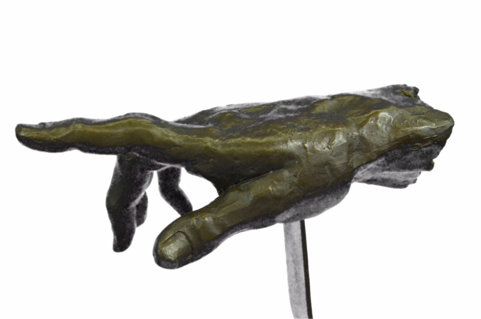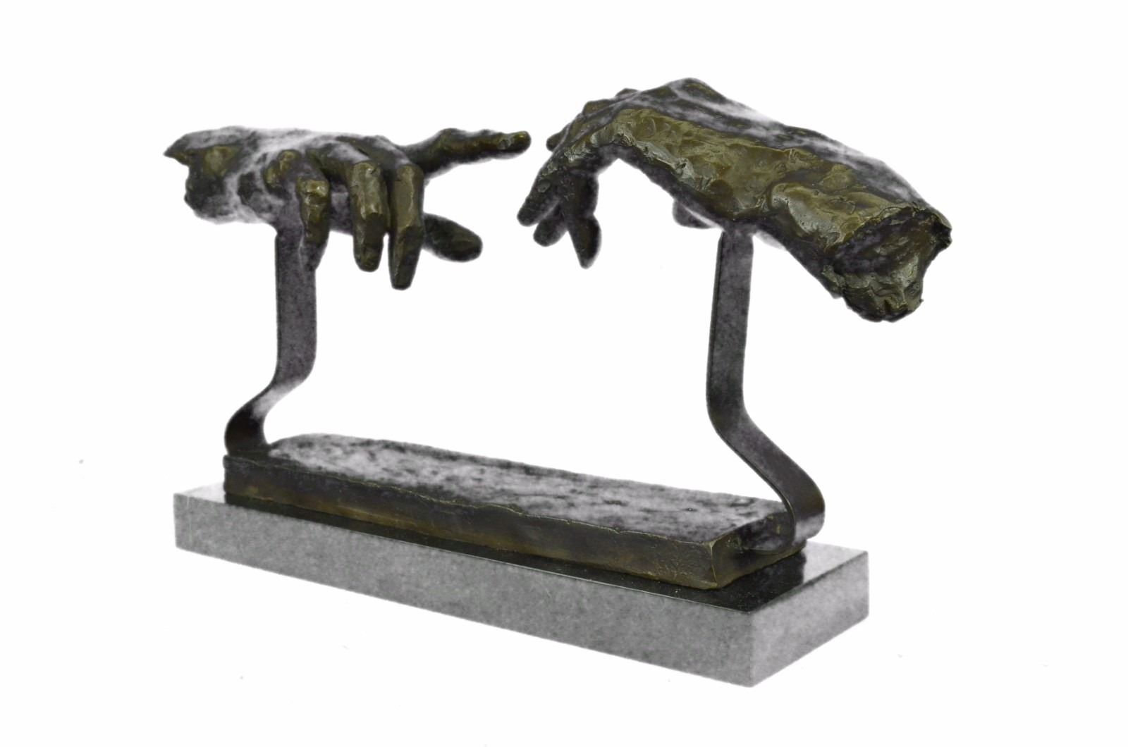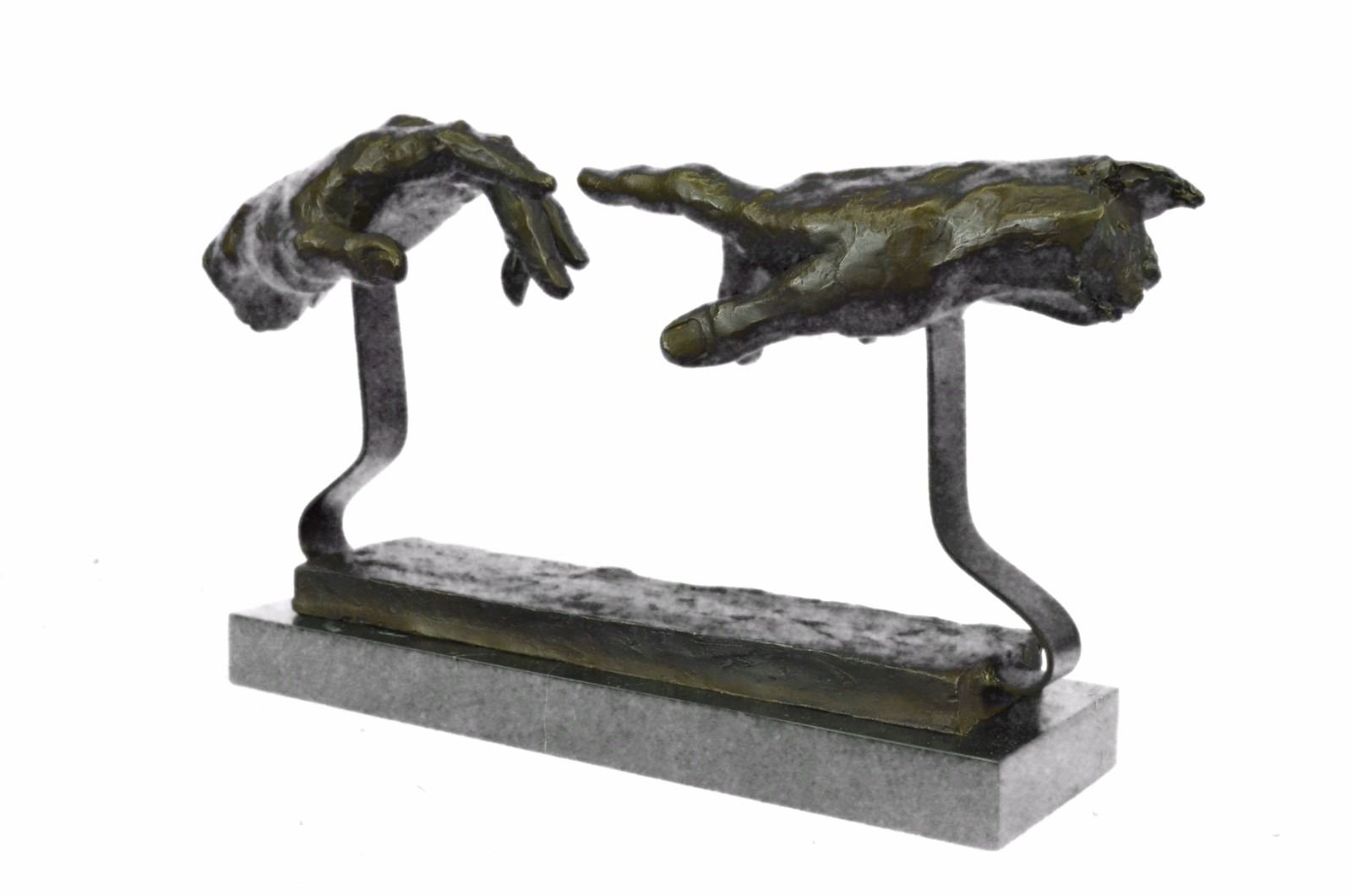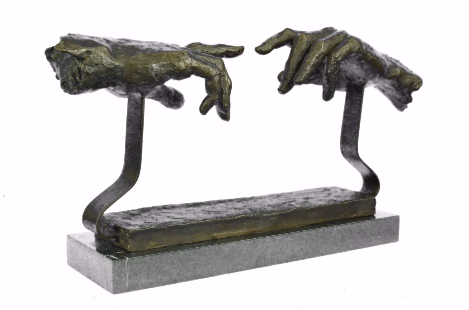 This Is A Unique Representation Of The Famous Artist, Michelangelo'S Painting, The Creation Of Adam. The Painting Is A Section Of Michelangelo'S Fresco Sistine Chapel Ceiling Painted Circa 1511. It Illustrates The Biblical Story From The Book Of Genesis In Which God The Father Breathes Life Into Adam, The First Man. Our Artist Has Transformed This Historic Painting Into An Abstract 3-D Form. Only Nine Of These Pieces Were Carefully Hand Crafted, Resting On A Solid Black Marble Base. Bronze Dimensions With Marble Base: Height 9 X Width 18 inches. Weight: 12 Lbs. Please Note: This is a reproduction bronze sculpture from the original molded and signed. This featured bronze sculpture is a recast after the original, and has been done recently. This 100% bronze sculpture is an abstract piece certain to be a conversation piece.