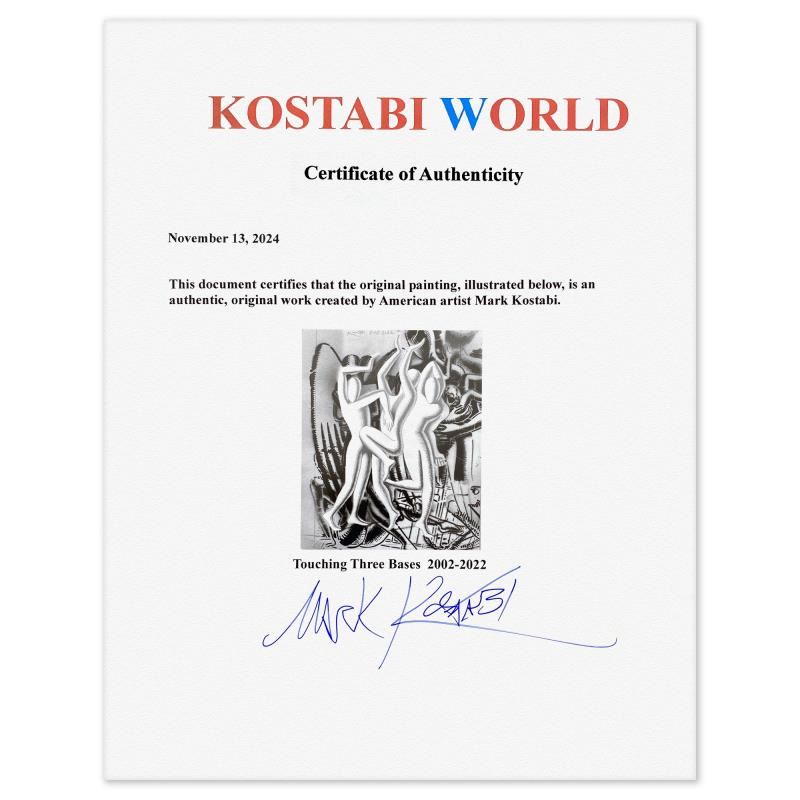 "Touching Three Bases" is an original mixed media drawing on paper by Mark Kostabi, hand signed by the artist. This piece comes custom framed. Includes Certificate of Authenticity. Measures approx. 20" x 17" (frame), 14" x 11" (image). This item requires special handling and may have a longer than usual turnaround.