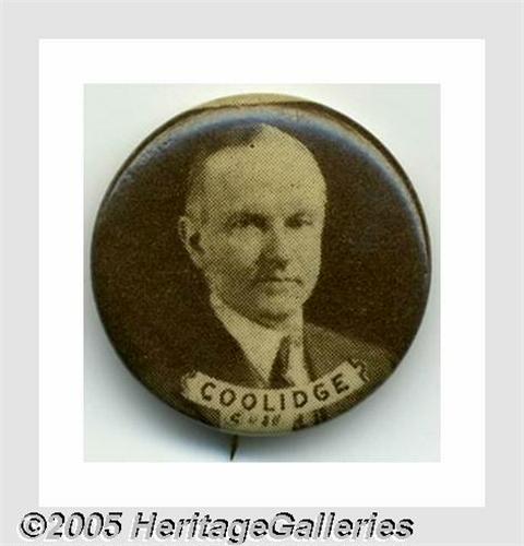 <B>Tough 7/8" Coolidge Portrait Pin</B></I> This attractive sepia design comes in several sizes, of which this is the smallest. All are scarce. Great condition. Lot:262