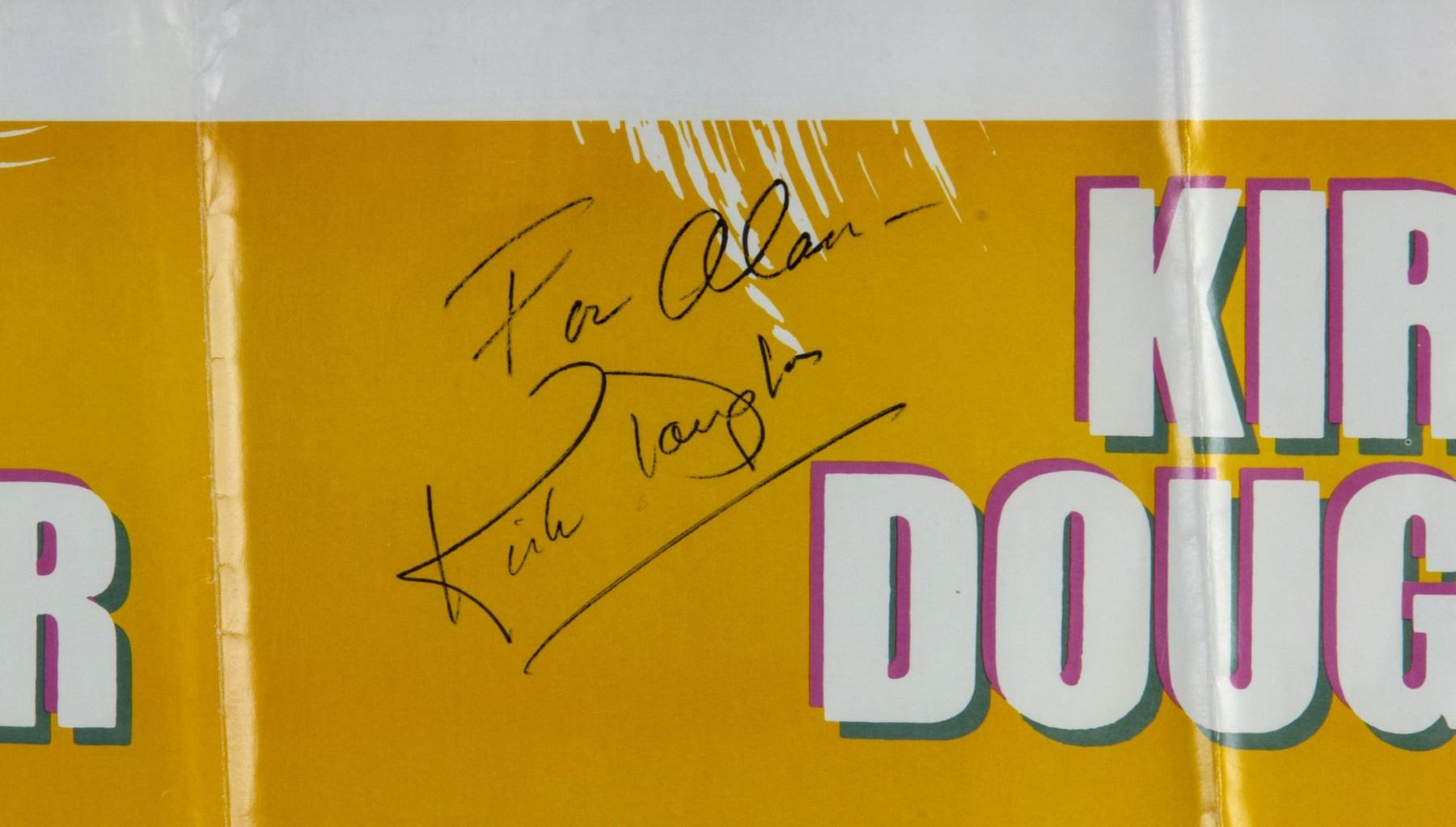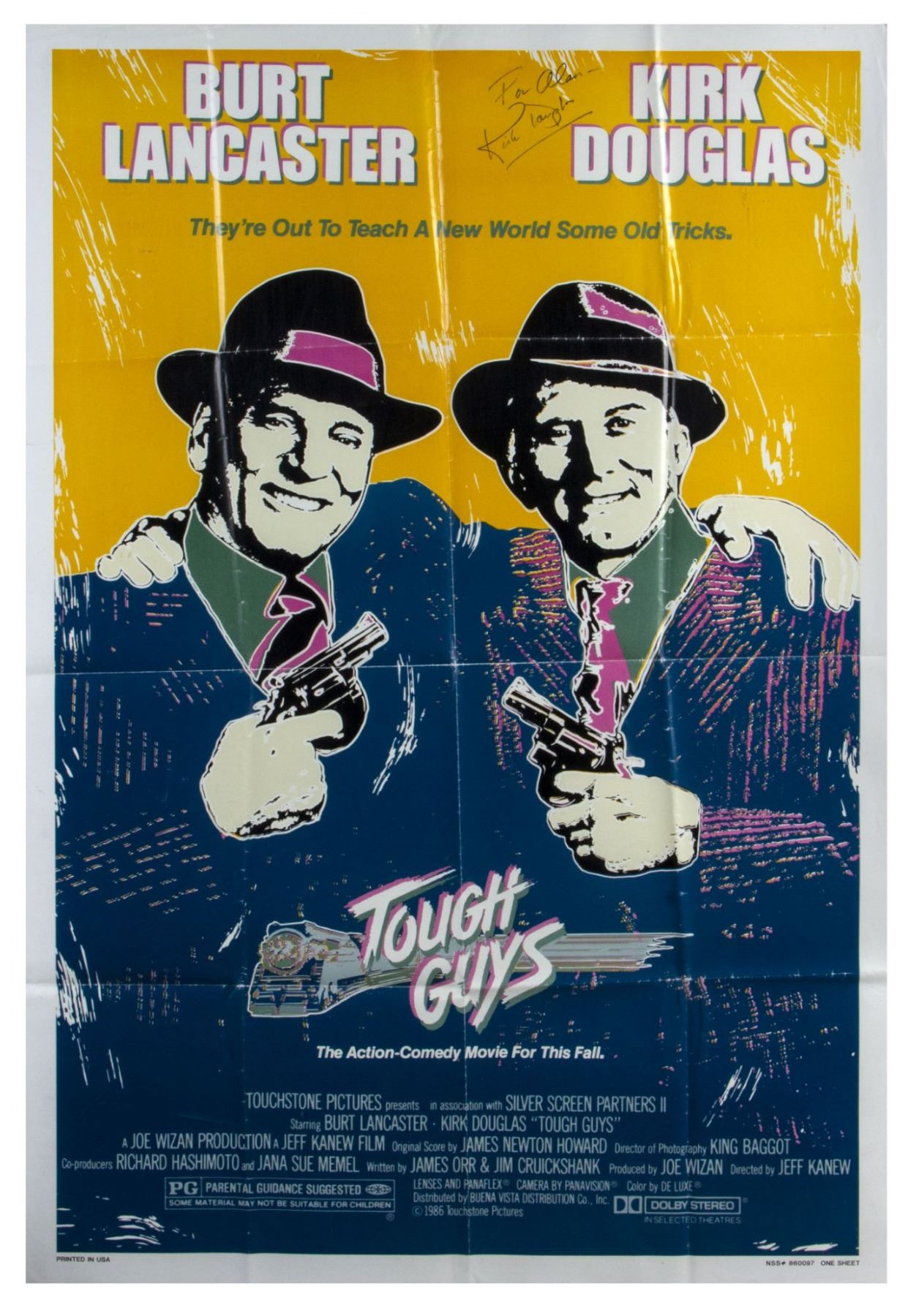 (Buena Vista, 1986) An original one sheet poster for the feature film "Tough Guys" starring Burt Landcaster and Kirk Douglas. The poster is autographed "To Alan" by Kirk Douglas, and measures 41"x27". The condition is good, with some wear to the fold-lines and edges from storage.