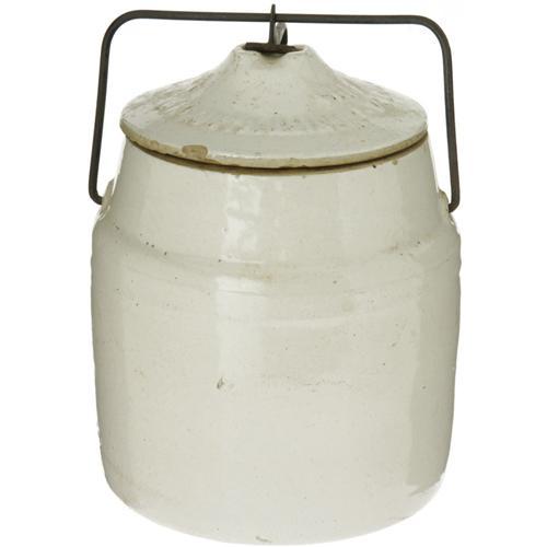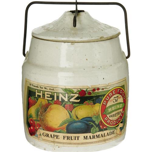 <B>Tough Size Heinz Label Marmalade Crock.</B></I> This has one of the most graphic labels presented in this sale. Heinz has been the American standard for condiments since 1869. This large size crock with original lid and clasp was filled with 10 lbs. net weight of Heinz Grape Fruit Marmalade. Colorful fruit adorn the label that measures 9.25" across the front of the 9.5" tall crock. Little damage to the label with minor edge wear and a tear on the pear that has been lovingly maintained. Mostly a reusable or disposable item, this piece is virtually mint with minor chipping to the crock lid and rim. If you're looking at the crock though, you're missing the point.