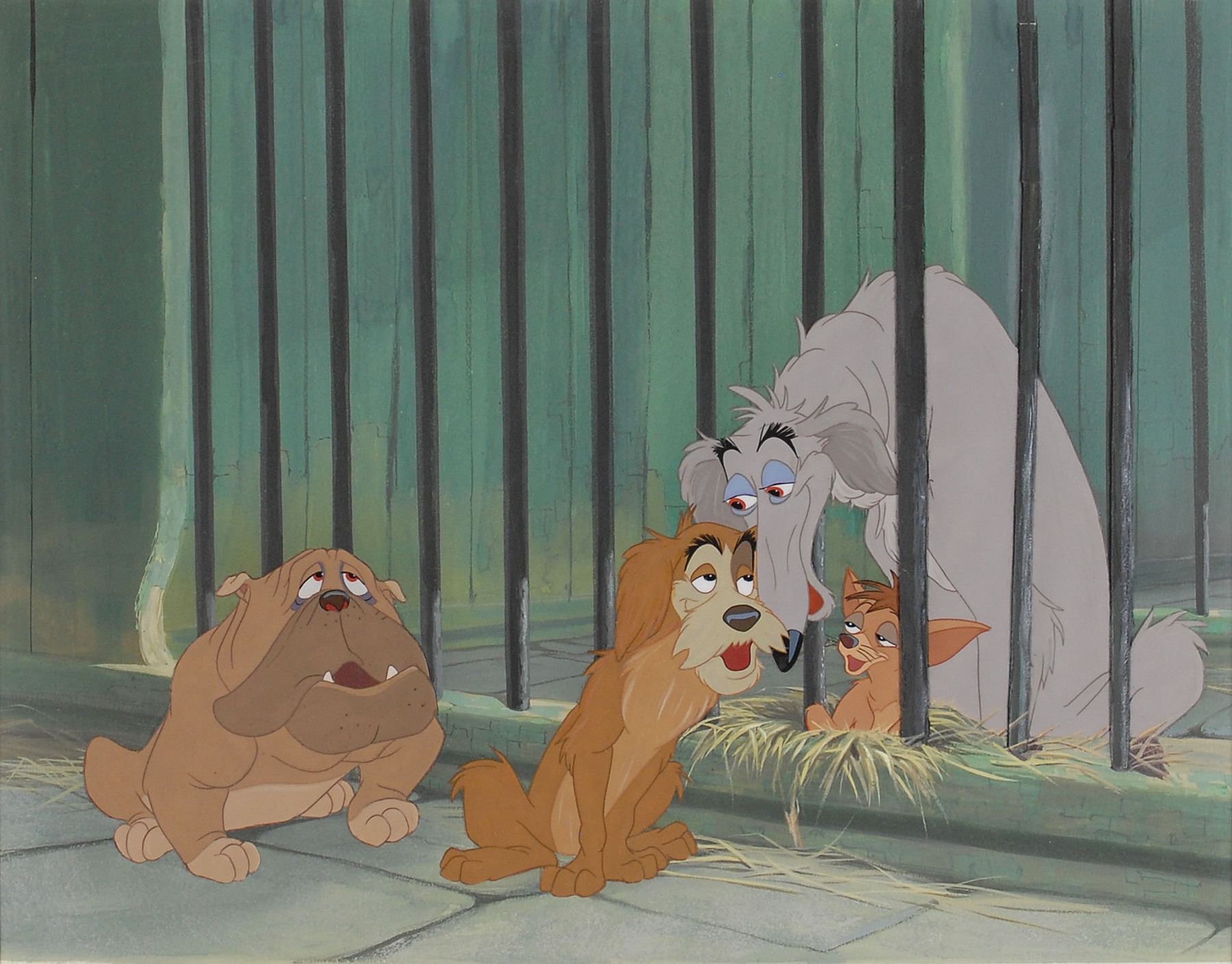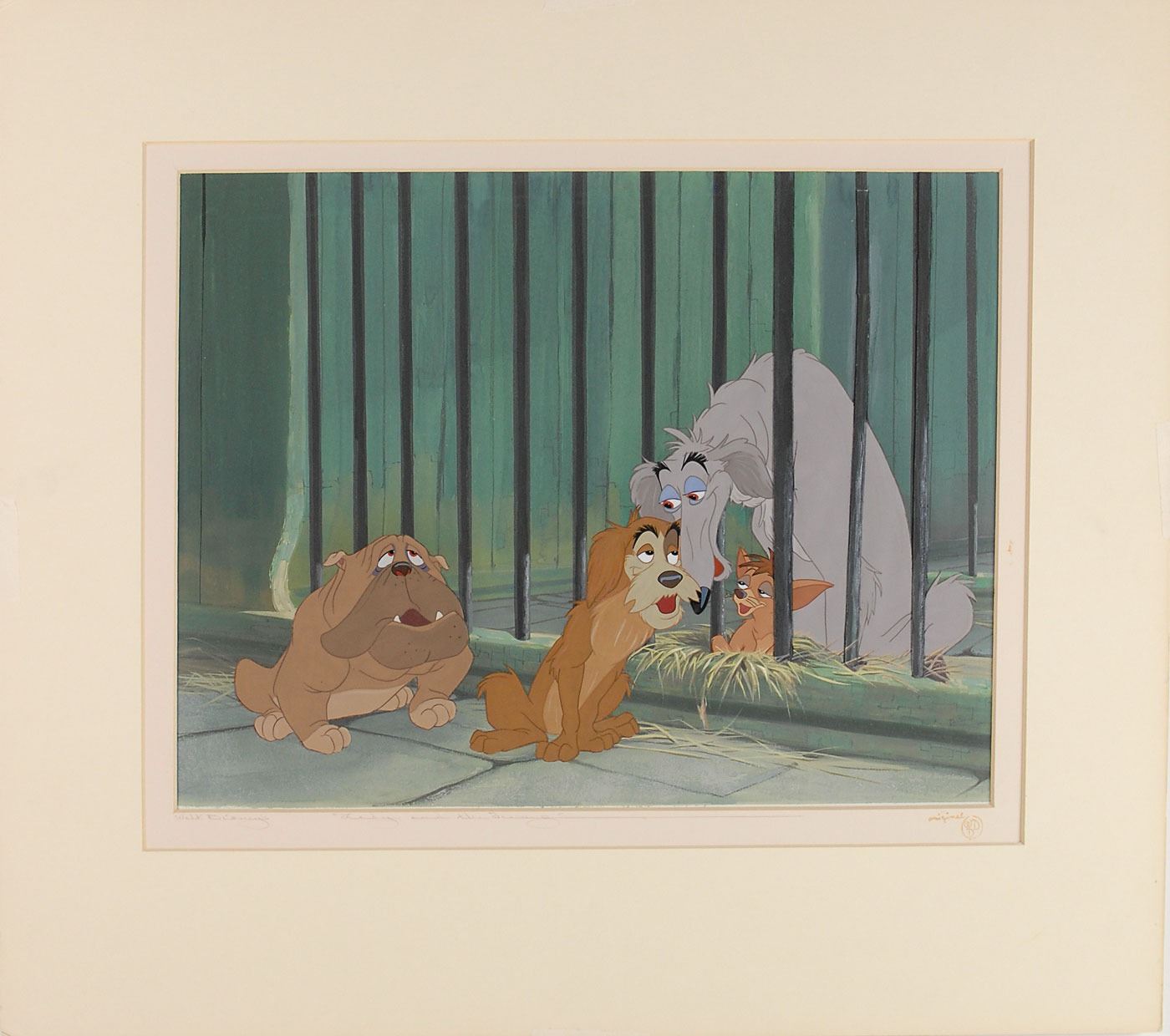 (Walt Disney Studios, 1955) Original production cels featuring Boris, Pedro, Toughy, and Bull from Lady and the Tramp. The cels have been trimmed and applied to a hand-painted background. Total image measures 12 x 7, with a mat opening of 11 x 14. Double-matted to an overall size of 20 x 18, with the fully intact original Walt Disney label on the reverse which states, "This is an original painting on celluloid, actually used in the Walt Disney production of 'Lady and the Tramp.'" The inner mat is hand-titled in pencil, "Walt Disney's 'Lady and the Tramp,'" and bears the encircled "Original WDP" stamp. In fine condition.