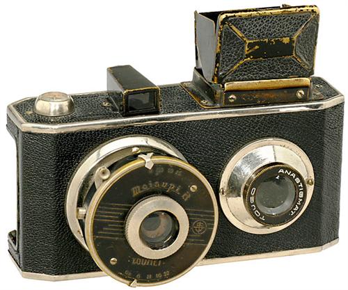 "Meisupi No. 1" (1st model), 1937 Tougodo Optical Co. Toyohashi, Japan. 35 mm TLR with direct and reflexfinder. Meisupi Anastigmat 6,3. Toumei shutter 1/25-1/100 sec., B. - Very rare! - Literature: Not in "Sugiyama"!<Br>