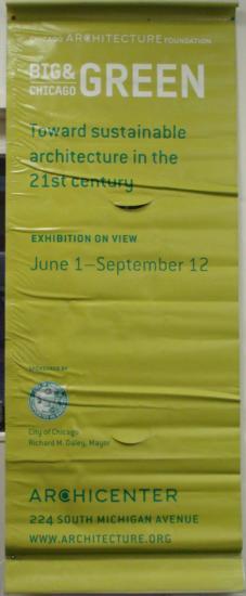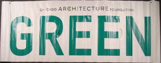 Chicago is a unique center of architecture and the theme of this tourism advertising signage. This is a genuine / original indoor or outdoor banner produced to promote tourism in Chicago, Illinois. This large vinyl banner was made especially for display in the city of Chicago. It is a two sided banner with one side mostly white background and large block letters spelling GREEN - Chicago ARCHITECTURE Foundation and the other side being a mostly green background with the exhibit location and date. The banner is about 6 feet 4 inches tall, and 2 feet 5 inches wide. The rolled portion at the top was made for a pole, and the metal grommets are for ropes to keep it tied down from the wind. For display indoors, you could use a long rod, or wires or ropes. It was made for display only, not for sale to the public, and it was only acquired through a special auction hosted by the city. It was originally hanging up somewhere around Chicago. There is some general light wear and soiling from use (probably hung out doors), but overall its condition is very good.