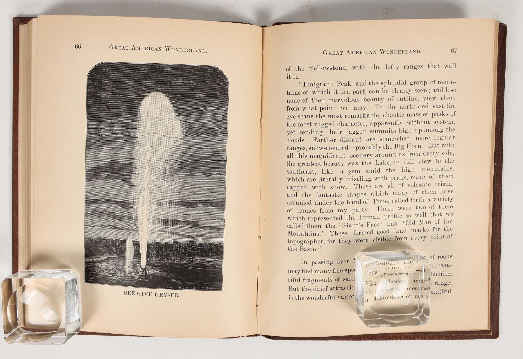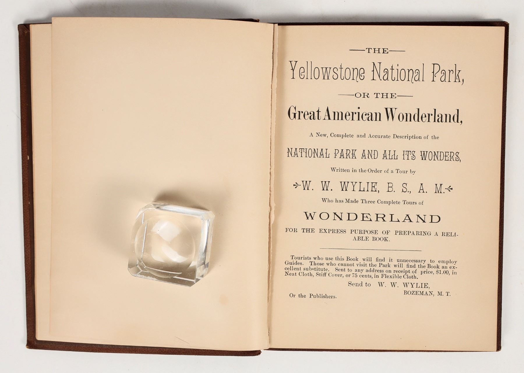 Copy of "The Yellowstone National Park, or the Great American Wonderland, A New, Complete and Accurate Description of the National Park and All Its Wonders" by W.W. Wylie, published inb 1882 by Ramsey, Millet & Hudson of Kansas City. The book educates tourists on the geography, attractions, and regulations of the national park, complete with several B&W illustrations and one map. Hardback, 99 pages + several pages of ads at rear, original fabric binding w/ gilt text and gilt image of Old Faithful on cover. Fine condition, some cosmetic damage to spine/cover and water damage to endpapers. See photos. 5.25"x6.75".