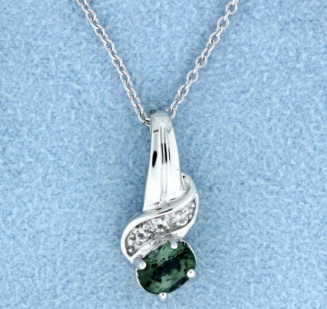 Stunning 14k white gold Tourmaline and diamond pendant. There are 3 brilliant cut diamonds that total 0.07 carats. The 14k white gold chain is 18" long and new. 2.8g
